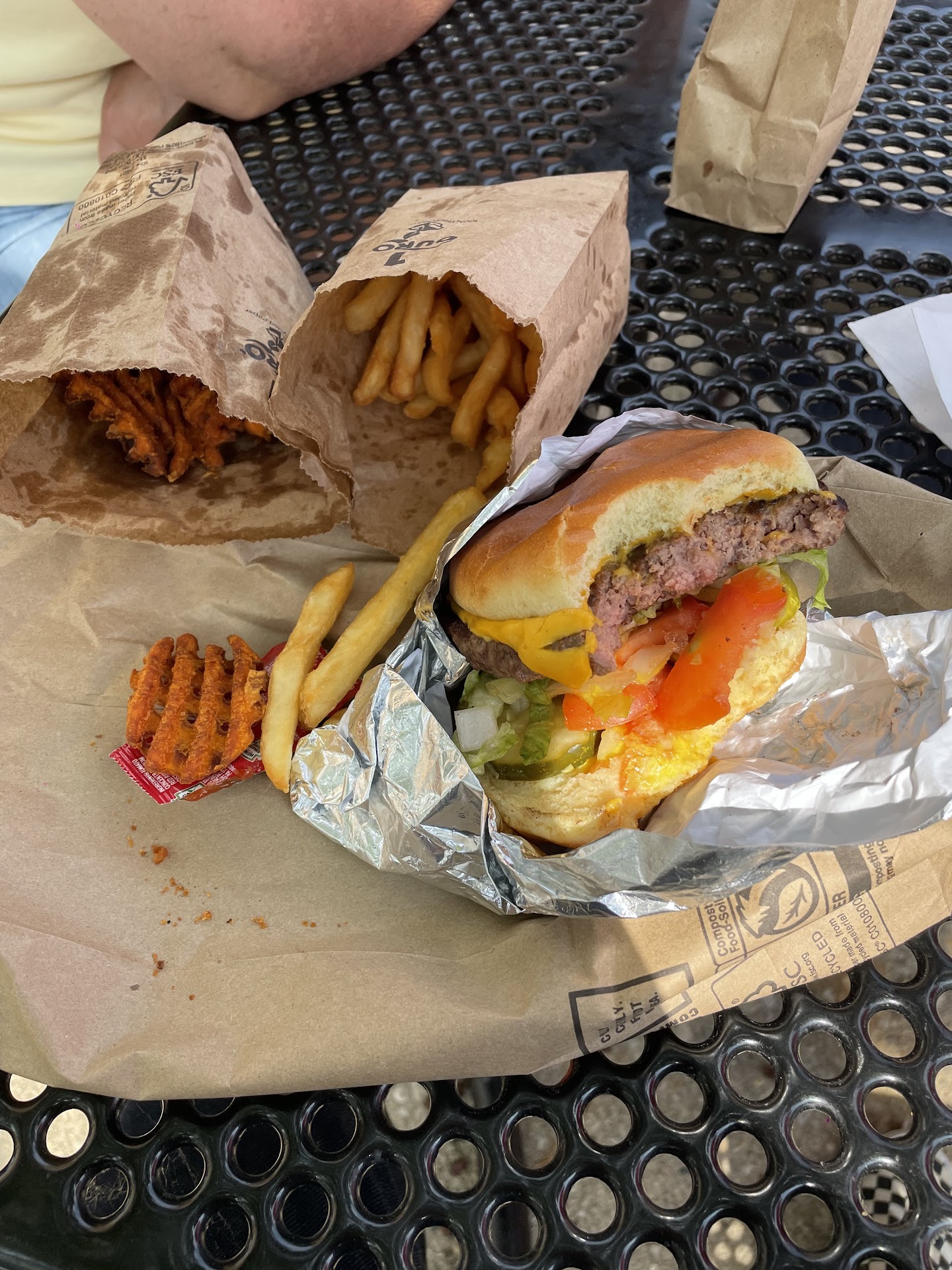 I'm handed my food. Of the three things I got - cheeseburger, sweet potato fries, and regular fries - only the sweet potato fries were hot. The regular fries and cheeseburger were lukewarm. Could have returned it but didn't because I didn't want to wait another 17 minutes.