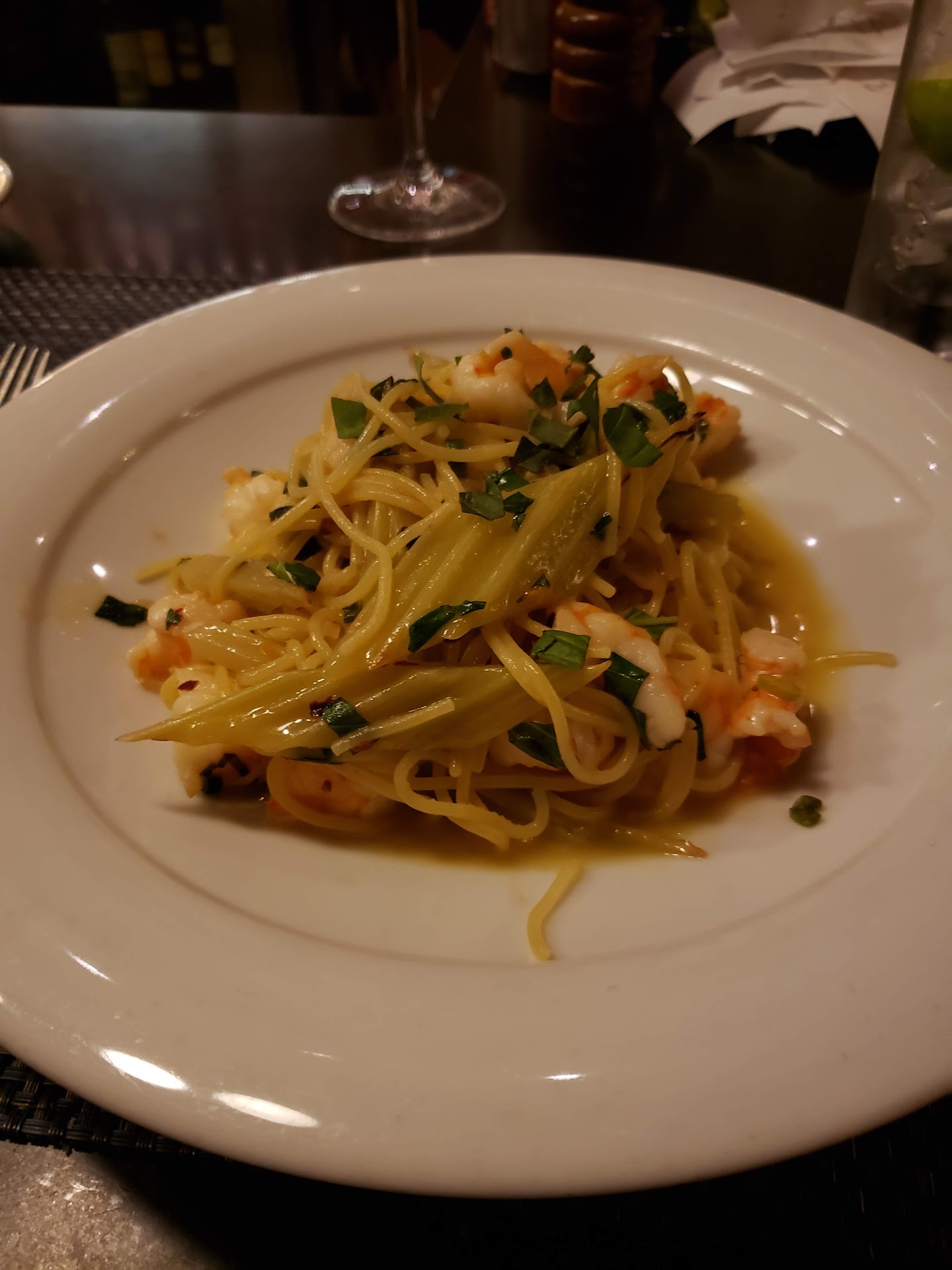 spaghetti with gulf shrimp, cardons, onions, in basil / red pepper olive oil sauce.