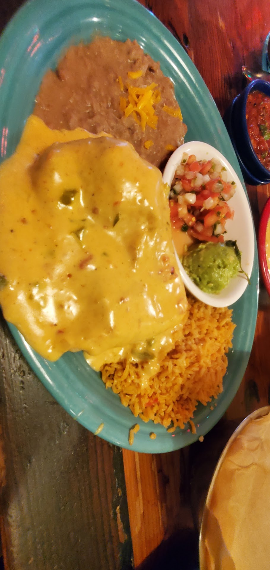 We entered the restaurant at 9:45 pm kind of cautiously, expecting to be told that the kitchen had closed, but to our surprise we were told, "Oh yes...please come on and be seated... we are open until 10:30". Both the waiter and hostess were extremely polite and made us feel right at home. Our waitress was the sweetest young lady and patiently answered all our questions as she professionally explained the menu and food choices. After taking our order, our food arrived promptly and was delicious, arguably the best Mexican food I have ever had--a claim to which my wife agreed as well. I had cheese and sour cream enchiladas, along with a Blue Goose tamale and refried beans and Spanish rice. My wife had the combo fajitas. We drank water and shared a drink which I believe was called a "peach cream margarita swirl" (or something like that), which was outstanding! We were full in no time and asked for our check, which was a very pleasant surprise at only $51. And, we even had enough food left over for dinner the follow evening at home--and it was even better then!
