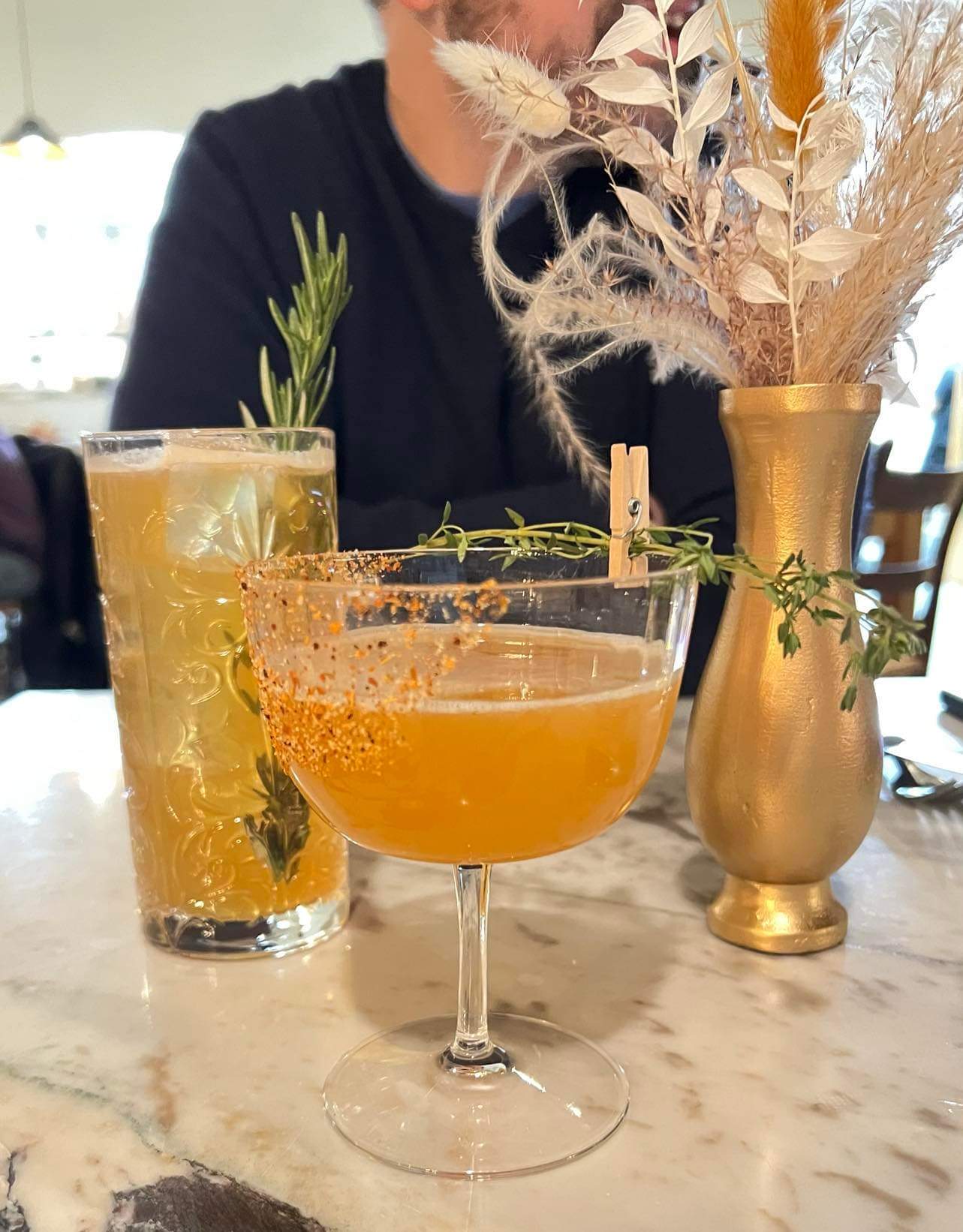 My wife Yoanna saw the place being set up this weekend so when we saw it was opening this week we had to try it. Let me just say: we were absolutely wowed from the very beginning. First note: the service! Hostesses were able to seat the two of us right away, but get this: while they were setting a table up for us, another member of the staff hustled up to us at the hostess stand to make sure we had been served. We went right to our table, which was a lovely two-top half-booth. The ambiance was very intentionally eclectic and we enjoyed the vibe. The table layout was just the right balance of "active" but not "crowded". Our server, Claire, was a joy. Very knowledgeable of the menu, and was able to recommend some drinks. I've unfortunately forgotten the names of them, but the first round was their take on a margarita -- simple but powerful! Perfect amount of tajĆn on the rim -- and the one with Sazerac rye in it. I really enjoyed the effect of the rosemary on that one. They clearly understand flavor combinations here, but more on that in a bit. Second round was their take on an Old Fashioned -- one of the better takes I've had, and it's usually my go-to. And you can see it had some of the clearest ice I've ever had! Wife had the one with ginger and shishito pepper in it. Delicious!
