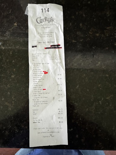 Okay. 2nd time ordering from this location since you recently opened. The 1st time I left without my drinks that were ordered. (I didn’t place order. Knew nothing about drinks). Today order was placed. When I went to the front hostess counter, I had to wait to be greeted because the hostess and a server were having a conversation. I am the type of person that will wait to be greeted, but when it hits the 20 to 30 second mark, I am going to interrupt and let them know I am waiting. My ticket # was 114. If you look at my receipt, I highlighted what was missing, and what was not completed on our order. Again. Hostess let me leave without my drinks. Luckily, I caught it on the receipt and walked back to counter and asked for my drinks. I love Corky’s. I get that new locations have bugs to work out. But this location has been here for maybe 3 months now. The food is always top notch, but the breakdown, in communication needs to be addressed. Never once had an issue with the Corky’s in Yucaipa. Not once. Order was followed to the tee. This location is in a prime area. If you don’t get your kitchen and front counter on the same page, you are going to continue to have issues with your orders for pick up. It sucks when you place the order. Give a tip, and then when you go to pick up your order, get home, and something is always missing, or the order is wrong. C’mon Corky’s. Your...