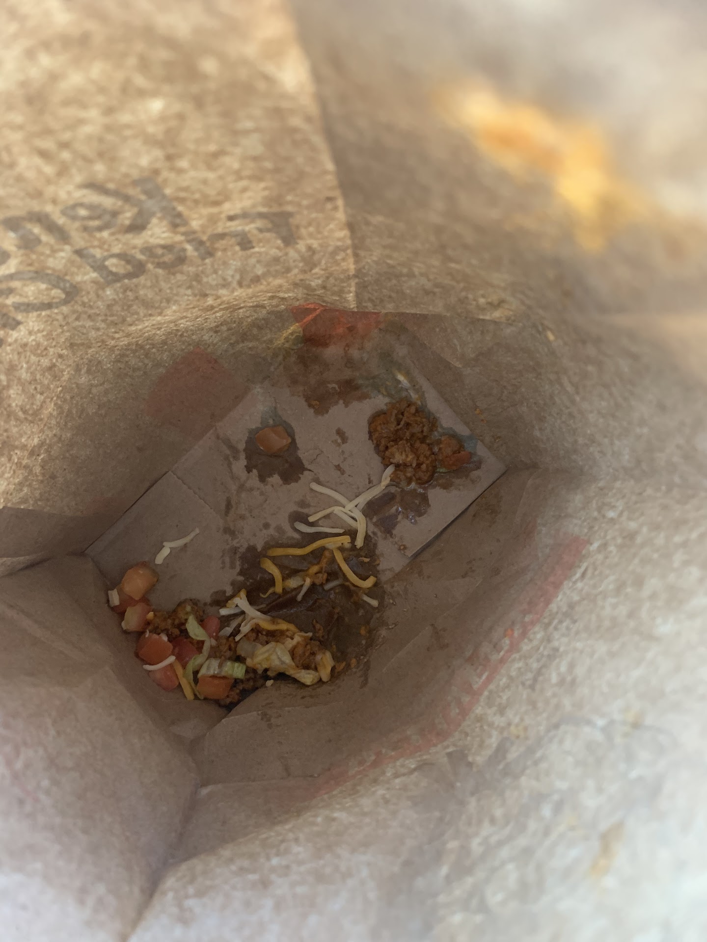 Read moreDisappointing is not a good word for our purchase, robbed seems more apt. I took pictures of what this Taco Bell charged us $16.30 for. There were literally a few dry spots of cheese (if you can call it that???) on the Cheese Quesadillas. The burritos had little in them with one tiny spot of sour cream at the very last doughy bite. The nacho potatoes didn’t even fill half of the tiny container they were in. I’m making something for us to enjoy now as our Taco Bell waste of money wasn’t even enough for a snack. You won’t get our business again and I will pass this information and pictures on to corporate! Your menu pictures are false...