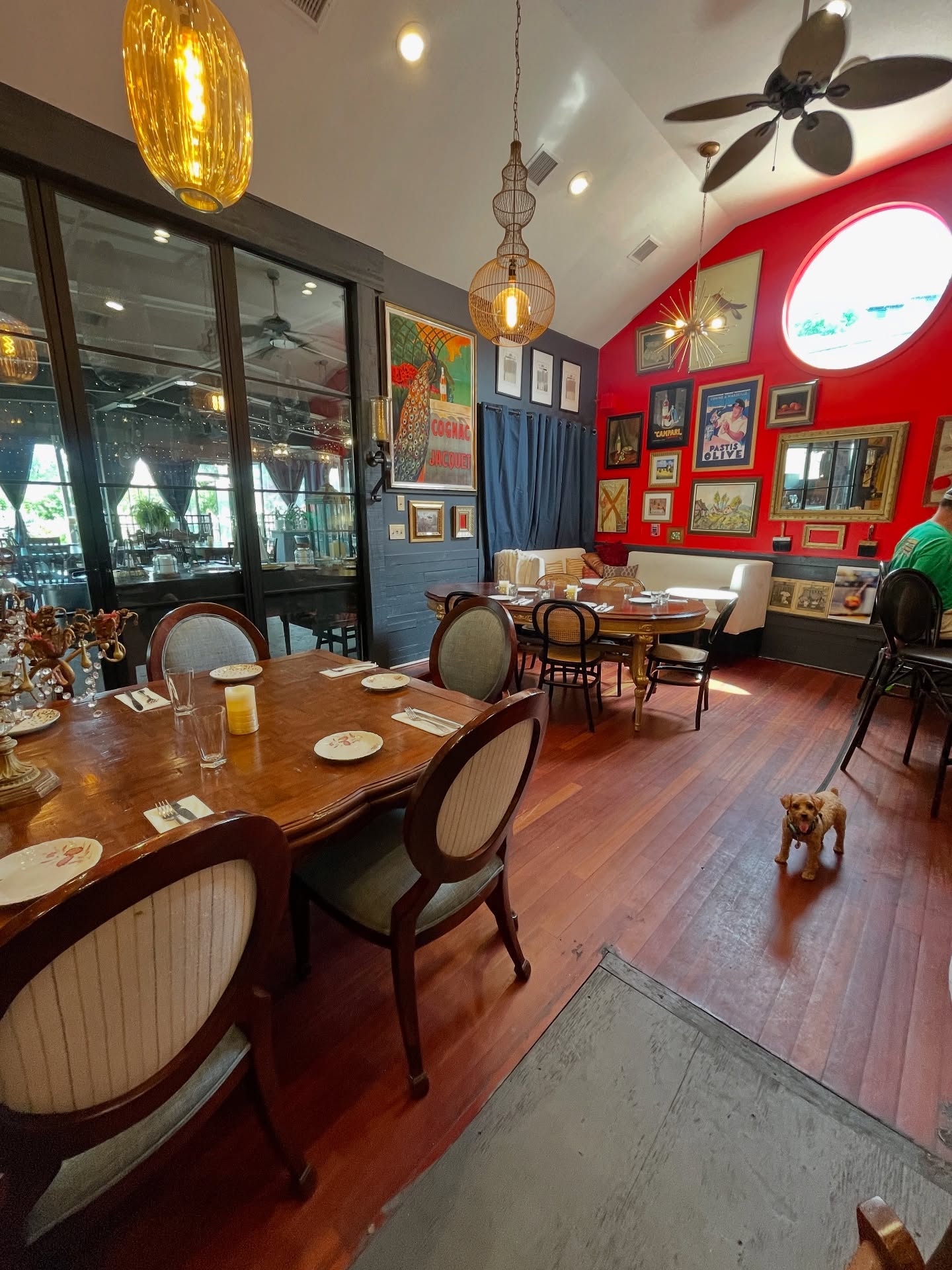 Indoors, the dining room exudes European charm with French-inspired decor, cozy colors, eclectic furnishings, and curated artwork. It features a few tables and a small bar.