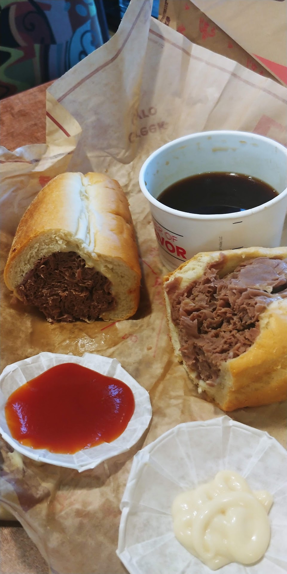 Read moreVery busy with a line up as I went in. Pairs and small groups of men on their lunch breaks. The line moved quickly even though there was only one register open. I ordered old school getting the original with the next choice up with additional beef. 1 small mozzarella cheese sticks and a small drink. The highly efficient man offered that he was charging me a combo meal to make the price better for me. My order came out fast, hot and perfect. I couldnt finish! A great experience The only negative...wishing they had more room in between tables for walking and sitting. Great idea for bar stool 2 seat tables placed furthest away so 1-2 will not take up 4 seat tables since bigger groups filled them all...