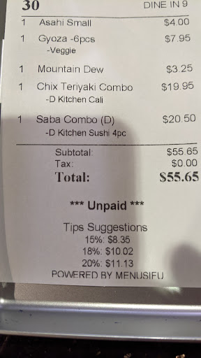 Read moreWe came for dinner at 6:45 pm. We were told there was a 30 minute wait for a table because their computer system was down. We waited for 40 minutes and our number was called. We were seated and someone brought us napkins, chopsticks, and menus. We quickly chose what we each wanted and then we waited. And waited. We saw two tables who came in after us have their orders taken while we continued to wait. Finally I got the attention of the person who appeared to be on charge to tell her we were still waiting for someone to take our orders after orders for two couples who came in after us were taken . She apologized and said a server would be right over.
