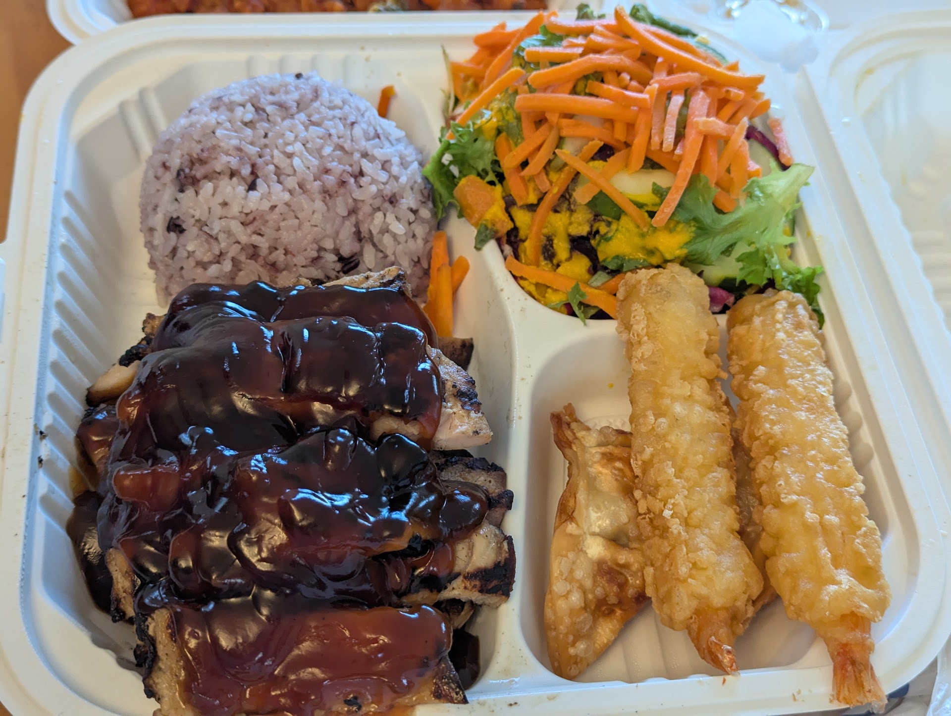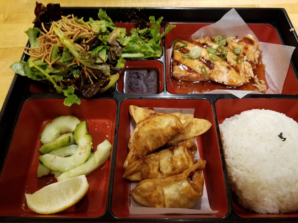Great value for their chicken teriyaki bento at $15. It comes with a leafy green/ carrot salad in a yummy dressing and 2 pieces of tempura / pot stickers with dipping sauce and rice (white or black mix). The chicken seems to be pre-marinated and has good char. The teriyaki sauce is slathered on top and is not too sweet and has a good flavor.
