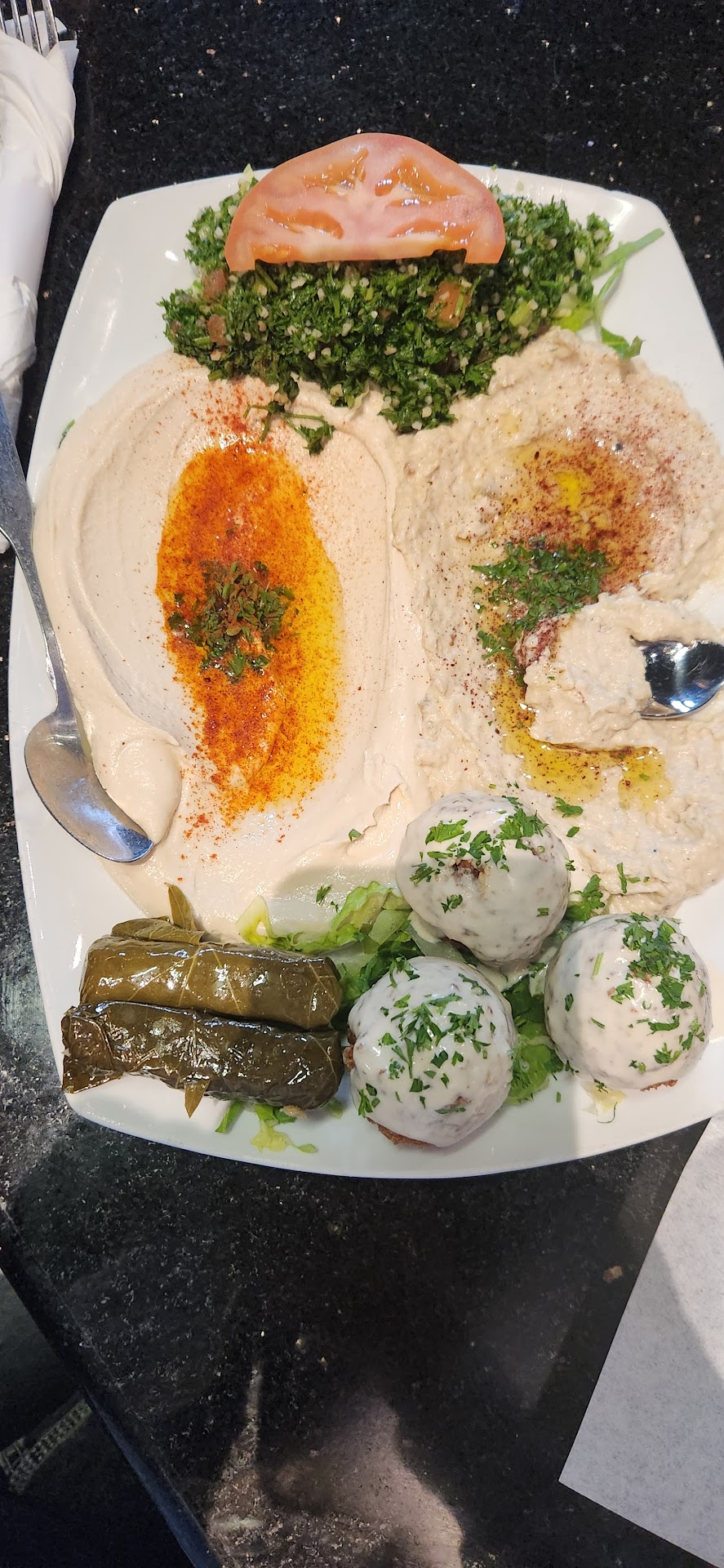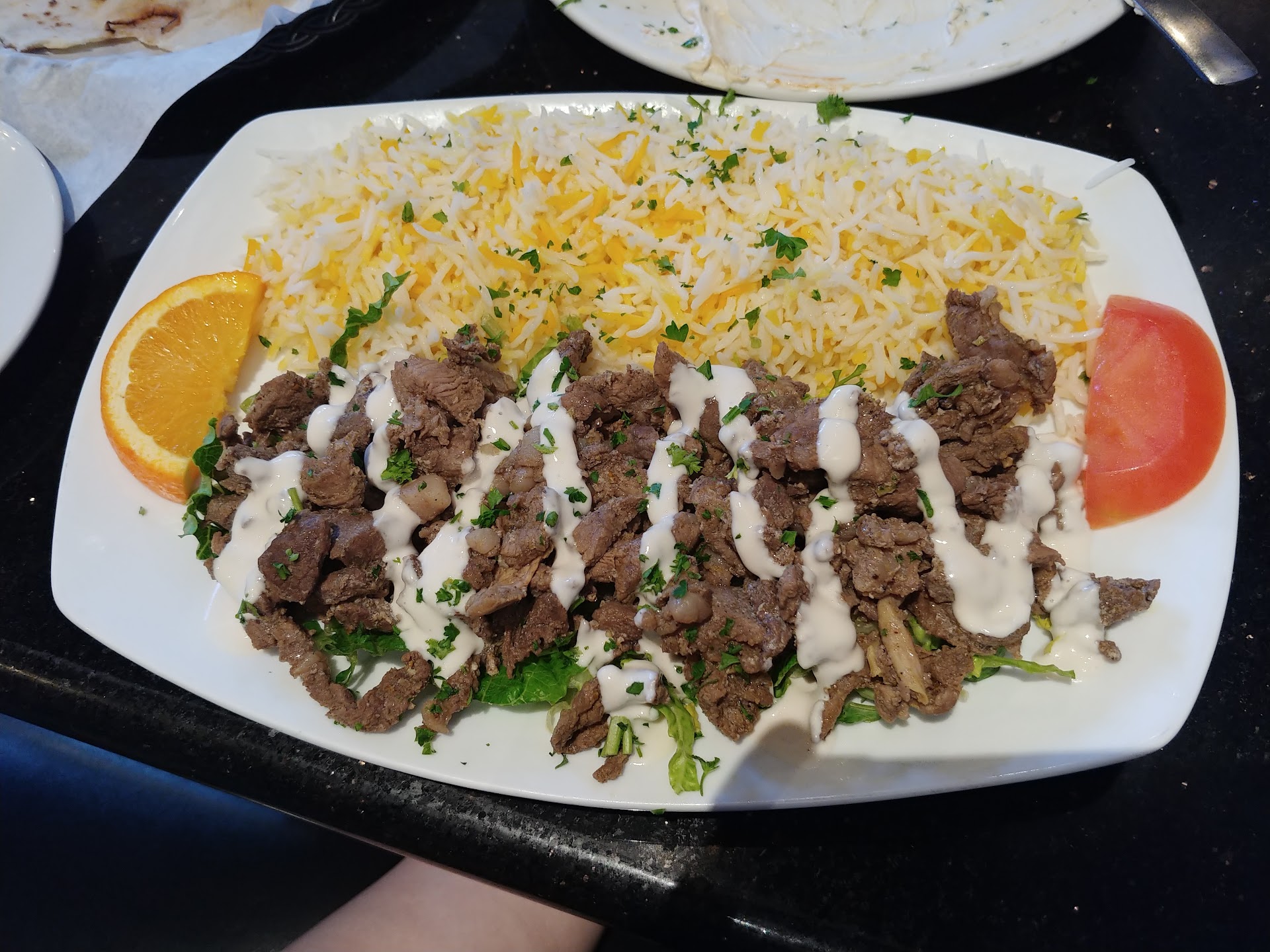 Read moreYum. Nice hole in the wall Lebanese place. Would be great for lunch or dinner. We had dinner. Started with Falafel and Humus. The Humus was delicate and smooth, an almost whipped texture with a subtil garlic hint. The Falafel was nearly perfect. Nice crunch that opened to warm flavor. The plate had 3 balls and a good amount of humus. Served with 2 breads. We stuck to the Beef schuarma and the Lamb Schuarma. Both served with Basmati Rice. The beef and lamb had great flavor. Good servings. Atop a bead of lettuce and an orange wedge. Though for decoration we squeezed it on our rice. The rice itself was a blend of basmati and saffron basmati. I liked the color it brought to the dishs. Together it made for a great meal. Then we did something out of the norm. We had dessert. She had the Oasis Special, Layered Cream and Cheese topped with rose water syrup. Yum, great finisher. I had the Baklava..... Yum...... Its Baklava so of course. But it was...