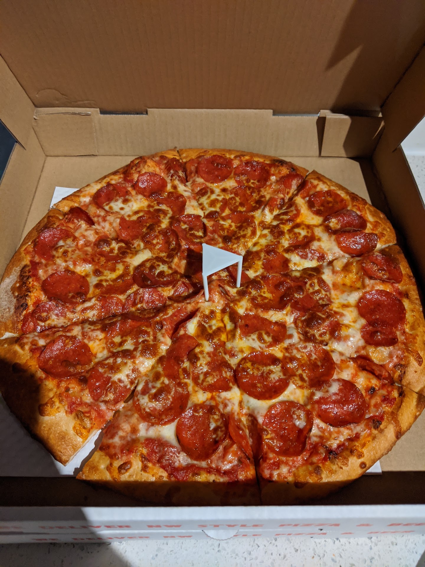 Edit: We tried once more and received another overdone pie that was this time handled incorrectly and squished to one side of the box. It's also quite watery, rather than the expected greasy. We will not be eating this suspicious food. But hey, the driver at least brought it to the correct door and undercharged us, even though we tried to correct the $1.50 error.
