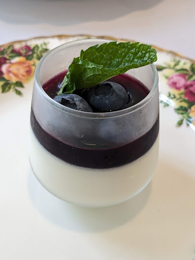 A gal friend and I visited Skywater on a rainy Sunday afternoon. I researched many tea rooms near Salem and she and I were impressed with the reviews and the huge tea selection. I had just visited The Hidden Gem tea room in Lodi, CA, a few months before and was curious to compare. (you can see my review of Hidden Gem on Google). Skywater is in a small cute cottage-style building, the reception and room decor and furnishings are chic and elegant, with large windows giving it an airy feel. We were greeted by Hans at the front and he seated us quickly. There is soothing music quietly playing, the unoccupied tables are all preset with proper white linens and lovely china place settings - each table in varying colors and styles. Hans explained the tea menu to us and then brought hot mini hand towels for us. Next we received tiny desserts consisting of decadent whipped cream and a raspberry coulis - yum.