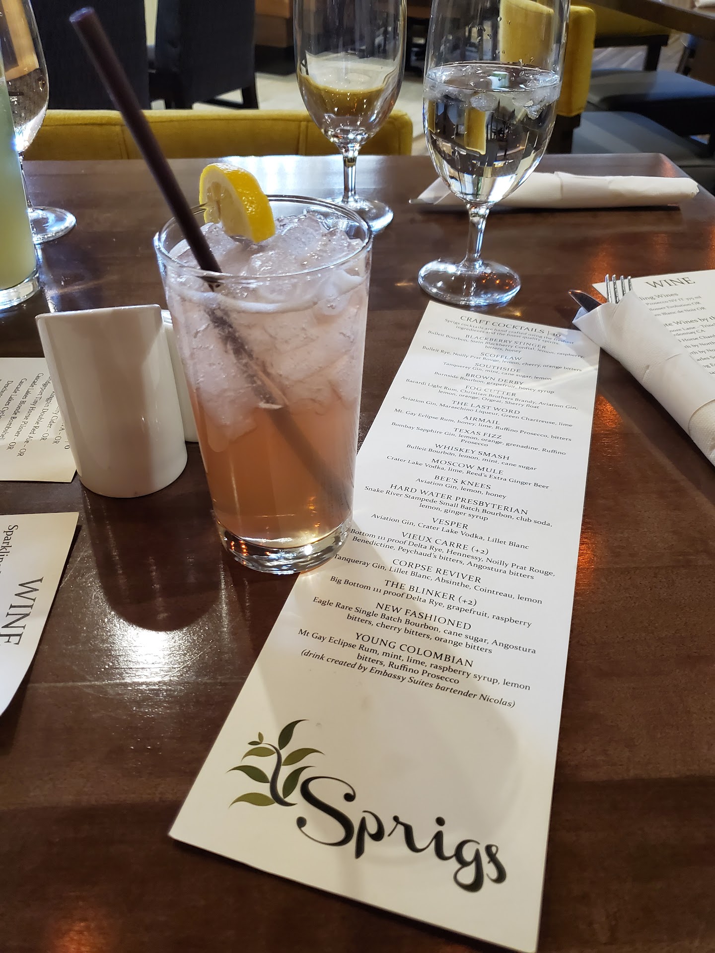 I love surprises. Of the good kind. This place has it. A business class hotel restaurant. The place you hope to have a rental car to avoid. Don't avoid Sprigs at the Embassy Suiites in Hillsboro. First, the bar has some great beers. The wine list? I'm not an expert, but it did seem kind of spare. The menu had some interesting selections I would have liked to try. Turkey meatballs with mole sauce? With others to help me, I would have been all over that. And looking at the pastas, and noodles with pesto as a side dish, an Italian influence is clearly on the menu.