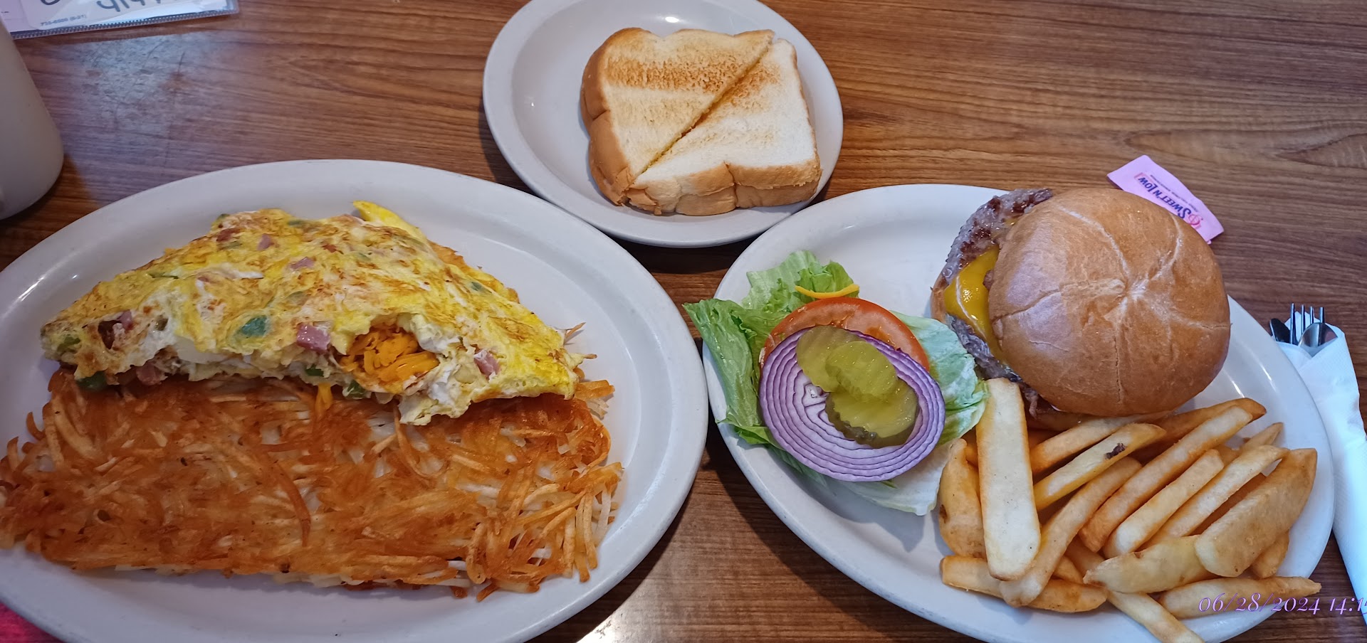 Read moreThe restaurant is spacious and has a full bar. The windows are tall, and while the seating near them is bright, the overall atmosphere is quite dim. We had the Denver omelet and the bacon cheeseburger. The Denver omelet was generous in portion and soft, with the hash browns on the side being crispy and very tasty. The burger was standard but still good. Both the black coffee and the coffee with milk and sugar were delicious. The iced coffee was a bit weak, but the free refills were a nice touch.