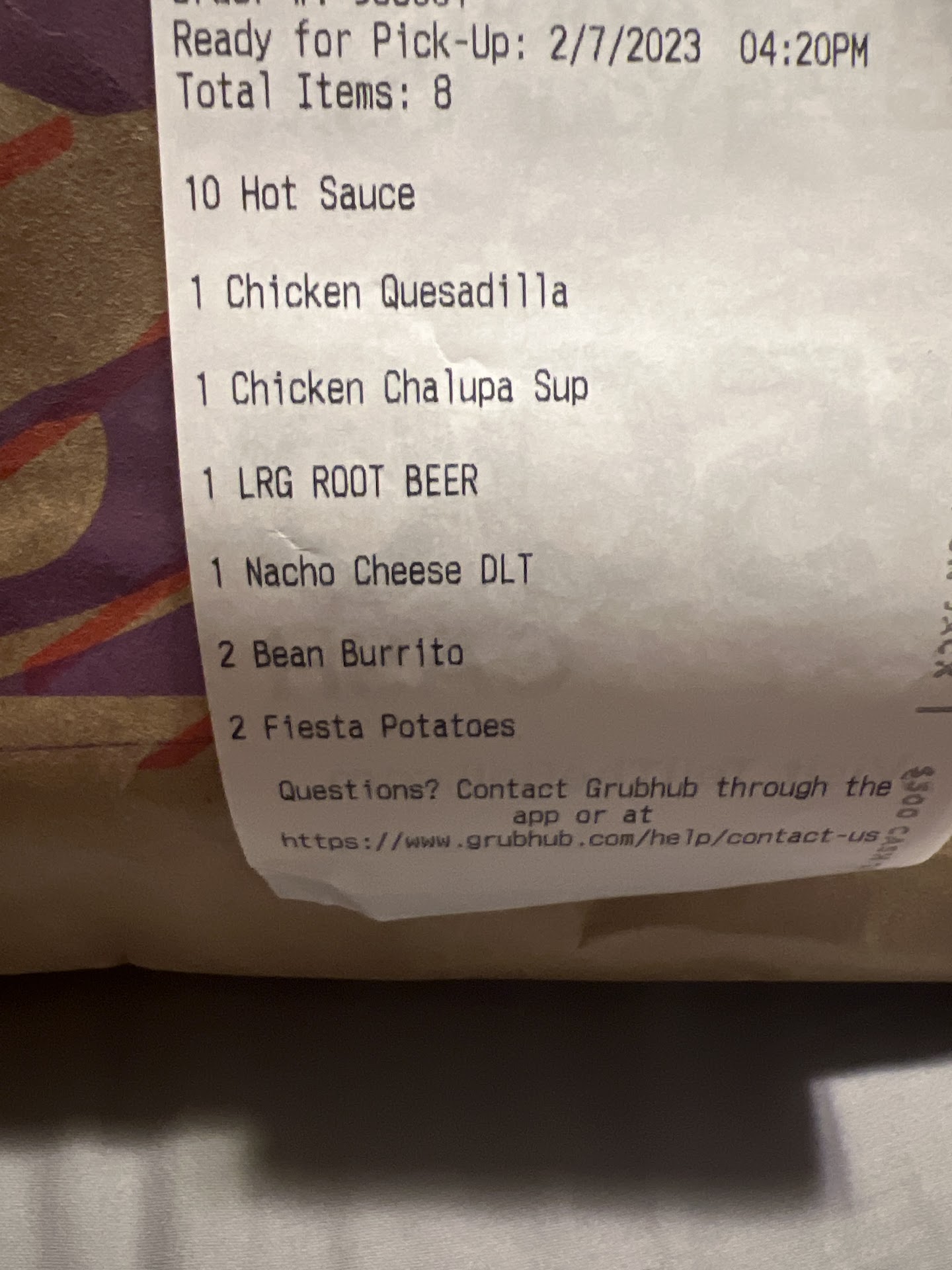 Read moreI usually order through the app since the steak quesoridto(however you spell it haha) isn’t on the in person menu, however the last few times the apps have been funky so I have to order at the window. I’ve had no problem doing this and they can make it. However tonight they were like we can’t make it. They said they didn’t have the button but I was literally I literally order it on the app and every other time the app crashed YALL can make it. The guy said nvm we could do it. I thought awesome until I got home and first it wasn’t grilled nor was it a steak, so I DROVE BACK, went inside they said they would remake it. Thought okay I see them grill it and I could t tell the meat since it’s in the back. I get home and guess what meat it was?! BEEF NOT STEAK. I was so hungry that I just gave up since I didn’t want to drive again and my other food was cold at this point. Also all my cheese sauces were only half filled, like it’s usually filled to the brim. I know everyone has hard days, but common on, my roommate has been having trouble at this location and I guess I’ll just have to go to a different one now to get the right stuff. I have photos to prove this and I’m debating if I should go in tomorrow to show them. I would upload here but on the mobile phone it doesn’t...