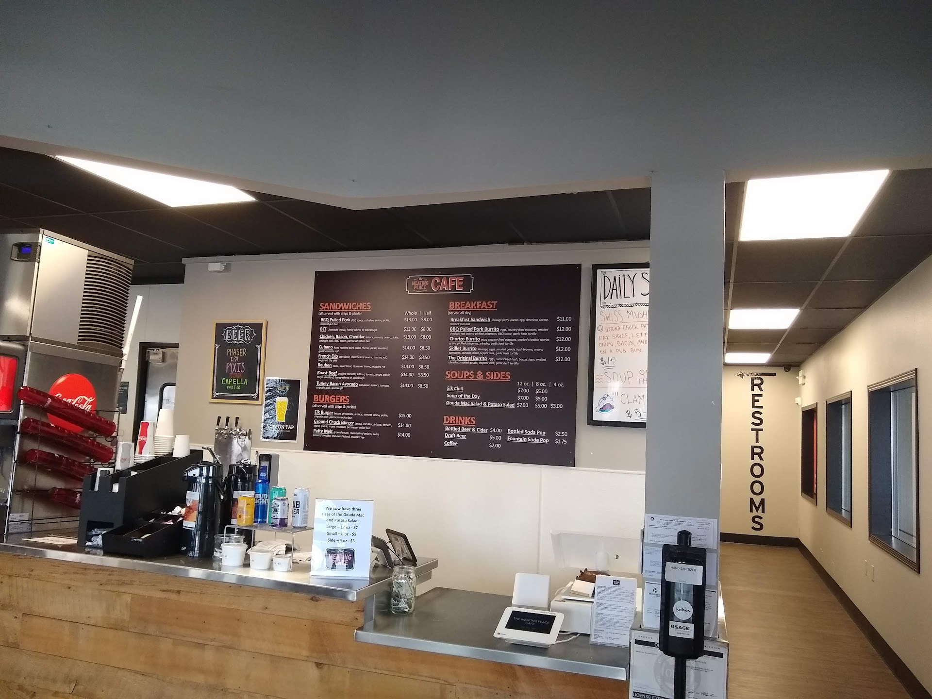 Read moreIt's becoming a tradition to stop at the Meating Place Cafe while also going to the butcher shop. Their sandwiches/burgers are fairly large & they come with chips and a pickle. I really like that they have an intercom system for announcing orders - great for those hard of hearing or outside waiting. The staff seem fairly friendly, and hard working folks. They have standard fountain beverages and some bottled options too. They also have coffee, but their coffee does look a bit sad, so I wouldn't recommend that. They serve breakfast all day.