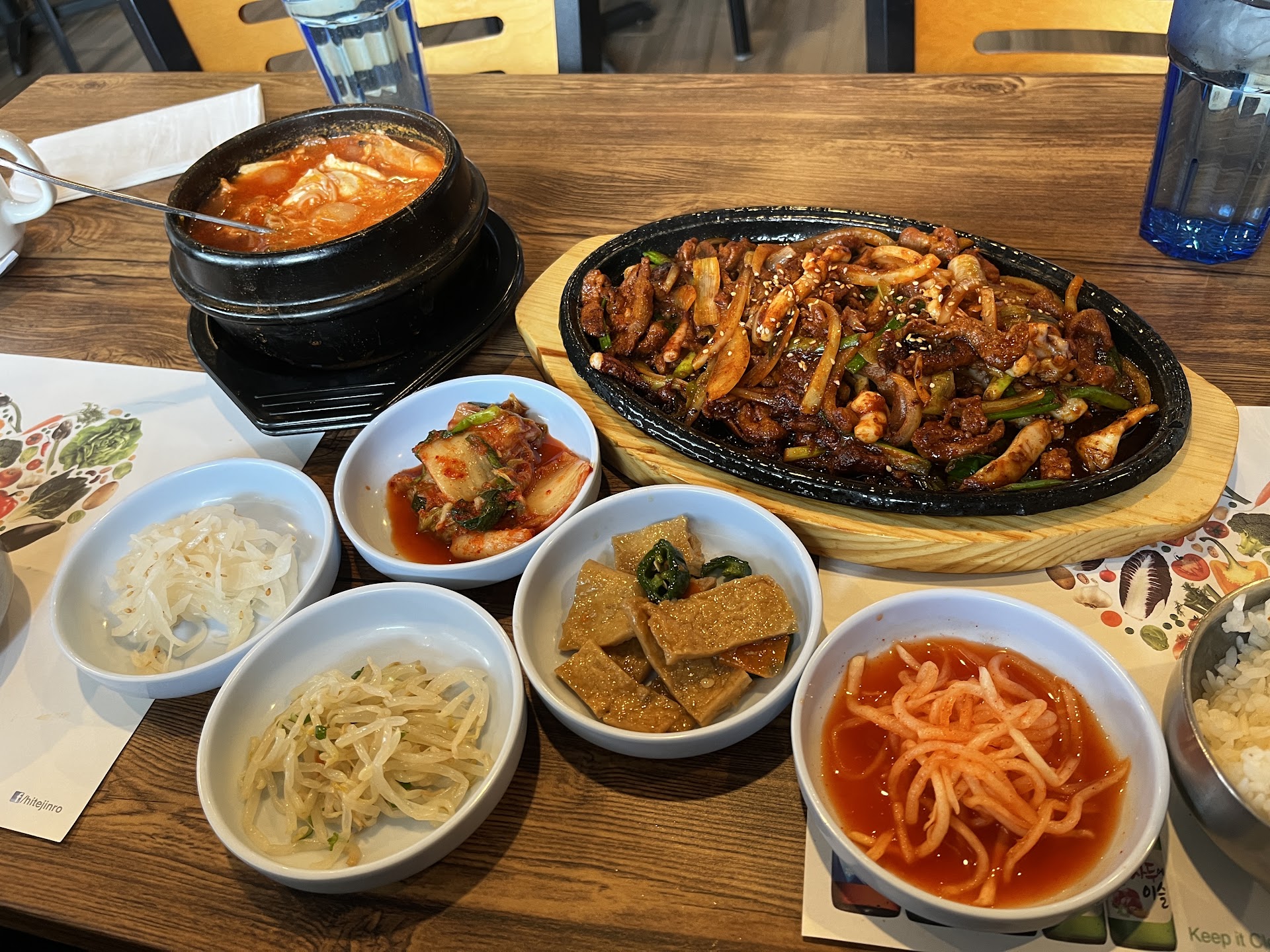 We ended up ordering the seafood kimchi soup and the spicy pork bulgogi dish, which were both okay. The side dishes were decent, but the rice was hard and felt like it had been sitting for too long. The owner came around to refill our tea, but on a couple of occasions, she only refilled my cup and not my wife's. Another time she came around, she refilled the table next to ours, and not our cups.