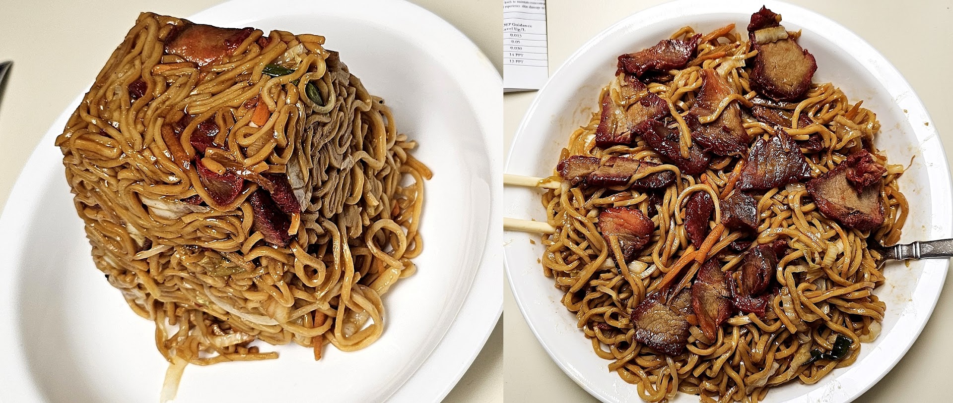 i usually order just noodles for chinese takeout lunch .. so first time here was roastpork loMein ,, it was too much soy sauce but it had nice chunks of pork and it was a quart size paper container ,, and not the reduced plastic tray size that is not a quart .. i will likely try other items here but will ask to go lite...