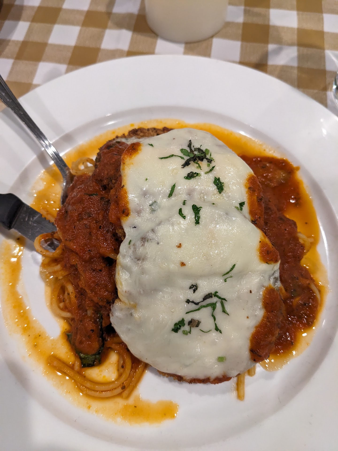 Mama Fanti is relatively new to the restaurant scene in Hillsboro, occupying the space that was formally Culinary Creations. They have both indoor and outdoor seating (if you want to overlook the parking lot), but I didn't see any heaters outside during our visit in January. We were able to snag a same day table reservation at 7pm on a Saturday. The dining room was about 75% full when we got there but was completely full about 30 minutes later. Dress was casual with many families dining. Noise is an issue here. It is nearly impossible to hear your tablemate over the din. Also keep in mind that there is only a single door to the space, so sitting near it will subject you to the elements. We were seated promptly, our wine was opened, and water poured. The bread provided was warm and tasty, but there was no separate plate for the herb infused oil... which was quite good. We started with the meat arancini and the zucchini rollantini. Service was quick, and the plating was excellent. I do wish the sauce was hotter, but the waiter informed me that was the correct temperature. In any case, the three balls were a good portion, and the filling was excellent. The rollantini was also quite good with a nice filling and tender but not mushy zucchini. Our main course consisted of chicken parm and chicken piccata. These dishes were well portioned with plenty of spaghetti and red sauce for the parm and a flavorfull sauce and mashed potatoes for the piccata. While nothing to write home about, they were certainly adequate. We shared a tiramisu for dessert. The waiter didn't answer when asked if the desserts were made in house, so I would say they are not. The flavor was good with plenty on liquor. Coffee and capacino (decafe too) are available. Parking is right outside, but spots may be hard to come by later in the evening as Mama Fanti shares it was a number of other businesses. Mama Fanti does not charge a fee for credit card use... which is a big plus in my book. Enjoy a meal with family at Mama Fanti. You will be...