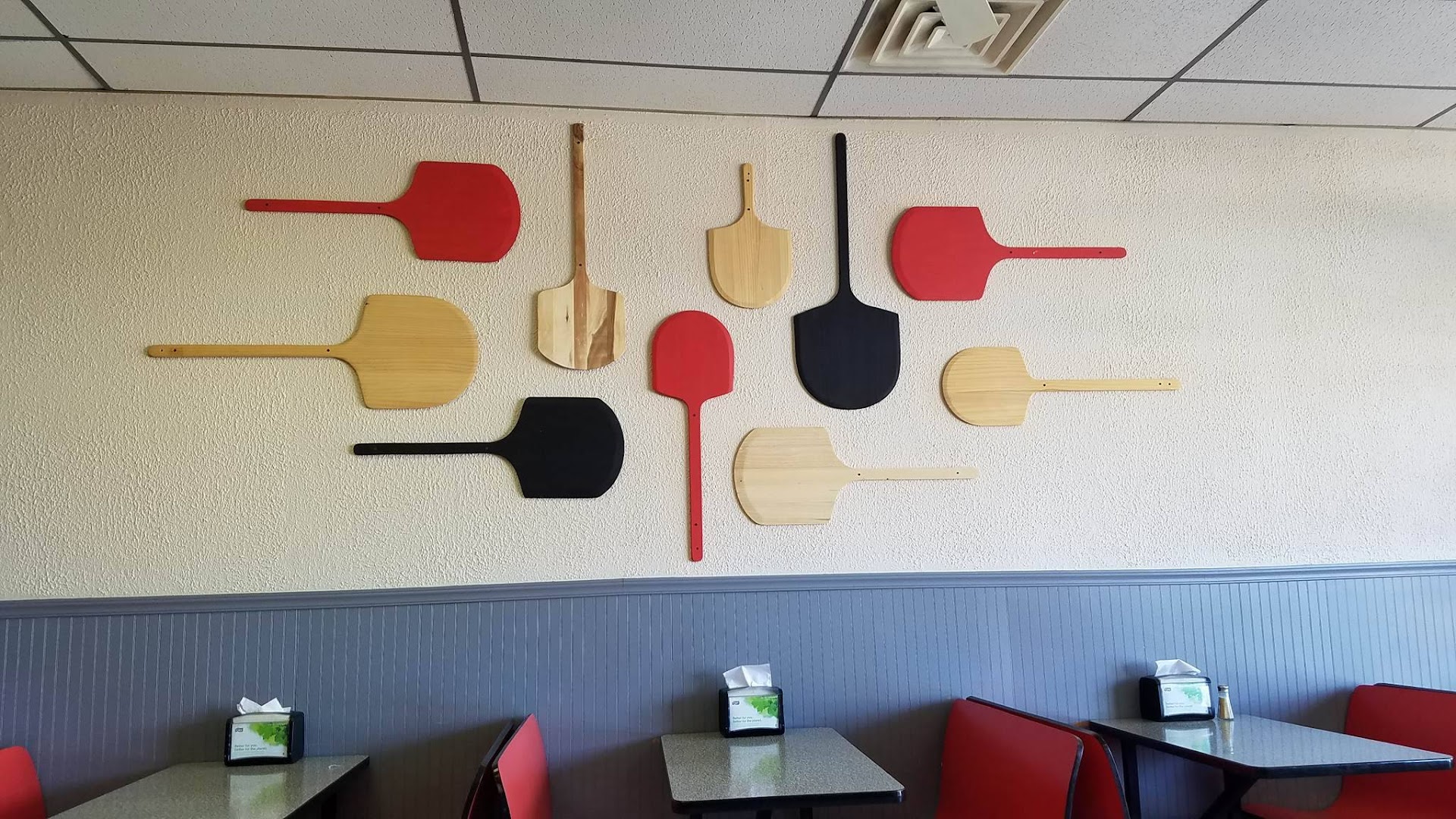 The pizzeria itself has classic booth seating with appealing pizza paddle artwork on the wall. There's plenty of parking and the staff is very polite and helpful. The establishment is very clean and as I mentioned before, the plain slice is one of the better ones I've tasted in the area of my home town. I will definitely be stopping in again...