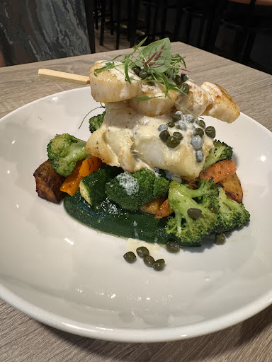 We (3) visited on a Friday night about 6:30. We waited approx 15 mins for a table, which, given the volume, was quite reasonable. We sat at a booth in the bar. We had the hummus & pita appetizer, which was very good. The hummus tasted home-made and fresh and there was plenty for the 3 of us. For main, we had a pizza, the shrimp & crab rigatoni, and the blackened salmon sandwich. All were fantastic. The salmon was fresh and well seasoned. The lump crab in the rigatoni was plentiful and my husband had plenty of pizza left to take home for later. Everything was hot, fresh and well prepared. We took dessert home - a slice of cheesecake and a creme brulee. Both were terrific. We thought the pricing was fair. Our server, Chloe, was outstanding. Friendly, polite, attentive and very professional. She is an asset to your establishment. Overall, we had an excellent experience and will definitely be back again! would like to suggest the addition of a few non-alcoholic "mocktails" be added to the bar menu. It's nice to have an option besides soda/lemonade for those adults (like me) who do not...