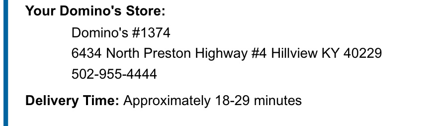 Ā Ā Ā Read moreI have always liked this Domino's location. All the drivers and anyone I've spoken to on the phone have always been very courteous and kind. I would like to thank them, in particular, for fixing our issue last night. I ordered the lava crunch cake at the request of my son who had gotten 100% on his math the day prior. We accidentally received bread bites instead. It happens. I called and explained and asked what I could do. The person on the phone apologized in a heartfelt way and said they'd just make a new batch and send them out right away. The new lava cakes arrived in 15 minutes! I am very grateful for that and son got his special treat! Thank you! Keep it up!