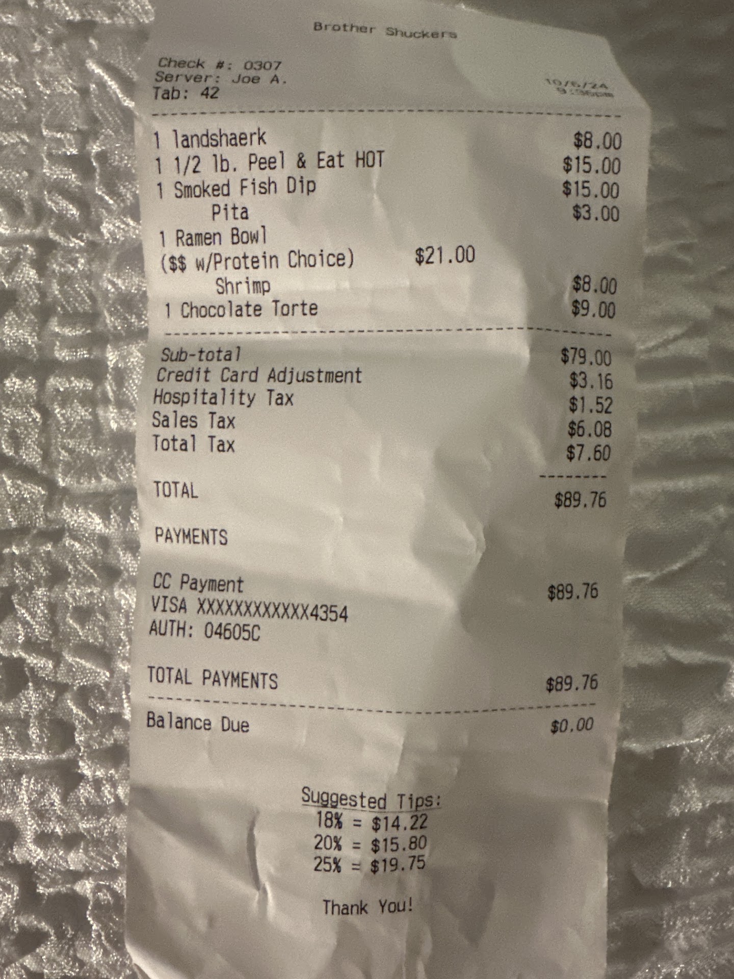 Read moreThe WORST experience ever ! My server was Sheri B. I ordered the Shuckers Roll and was not a big fan of the flavoring, so I politely asked the waitress for the menu so I can order something different (never asked for a discount). After looking at the menu for a few minutes the waitress proceeded to come over to me and ask what was wrong with the meal so she can explain to her boss. I politely stated that the flavoring was a tad bit off to me and I wasn’t a huge fan of it. The manager then came out and expressed to me that no one has ever had that kind of complaint about their food before as if I insulted them with hateful words. After expressing to him that I meant no disrespect he proceeded to say “I can only do half off” (again I never asked for a full refund). I told him it was okay because I wanted no trouble however I could sense the hostility from the staff so we just asked for the check. Upon receiving the check we were charged a state tax, liquor tax, total tax, and hospitality tax totaling at $80 for 2 meals (one of which we did not eat) cheese fries a margarita and a shot of tequila. We may be out of towners (Ga) but I’ve never heard of a total tax before. Once the signed receipt was given back to the waitress she proceeded to say “oh so I do t receive a tip now? I’ll be sure to not serve you all whenever you return” The people and service at this establishment were not friendly in the least bit and I am very...
