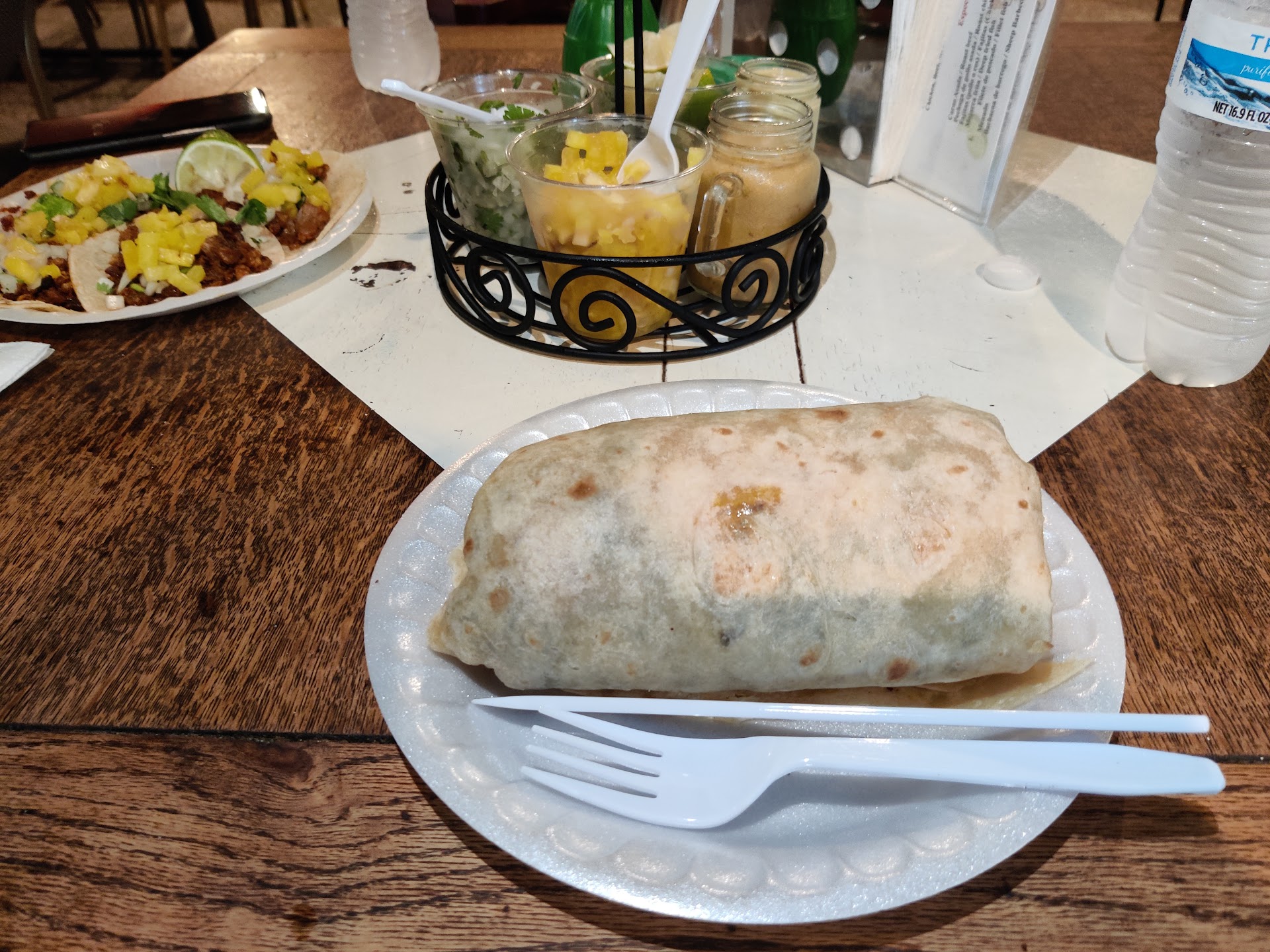 Read moreGreat place, very authentic but hard to navigate on your first visit. So basically you order how ever many tacos you want (I'd say at least 3). They come with a tortilla and meat only. Your server will bring a tray to the table with onions, cilantro, limes, pineapple, and hot sauces to dress your tacos how you want them. I opted to get a burrito instead of tacos and it was huge (and delicious). Definitely worth the price. I have no idea how much drinks cost because it's not on the menu but I paid $2 for a bottle of water (no tap water). Pay...