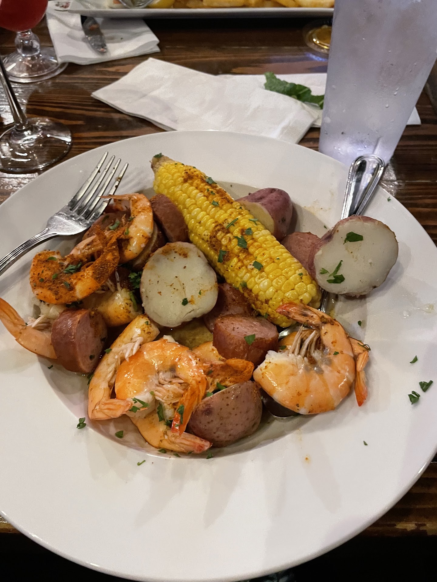 Read moreIt was our last night in HHI and we decided to look for seafood. We had driven by this place a few times and decided this is where we would have our last dinner. Yep. We are very glad we did this. There is outside as well as inside dining. The outside looked very tropical and fun, but we opted to sit inside. They have a cute gray cat who is definitely âfamilyâ. She has her own bed outside on the hostess stand, lol. We were seated right away and our server came immediately for the drink order. I had a Pom-tree tini which was very good, but not as sweet as I like them. There were 4 of us and we got the Low Country boil and the Captainâs trio, which is a cheesy, garlic parm sauce but with no pasta. There was scallops, shrimp and fIsh. It was served with 2 pieces of garlic toast. The boil was shrimp, potatoes, sausage and a small ear of corn. The sausage was very good, a bit spicy, but really tasty. The other 2 people with us got the shrimp baskets. 12 lightly breaded shrimp, fries and two hush puppies. You could also get a side salad if you wanted to. Go for the baskets instead of the platters. The platters are $5-6 more than the baskets, and they serve the same amount of shrimp. You get a few extra sides with the platter. The service was fast but not rushed. This is a very good place to eat. We enjoyed our meal immensely. Canât wait to come back next year in a...