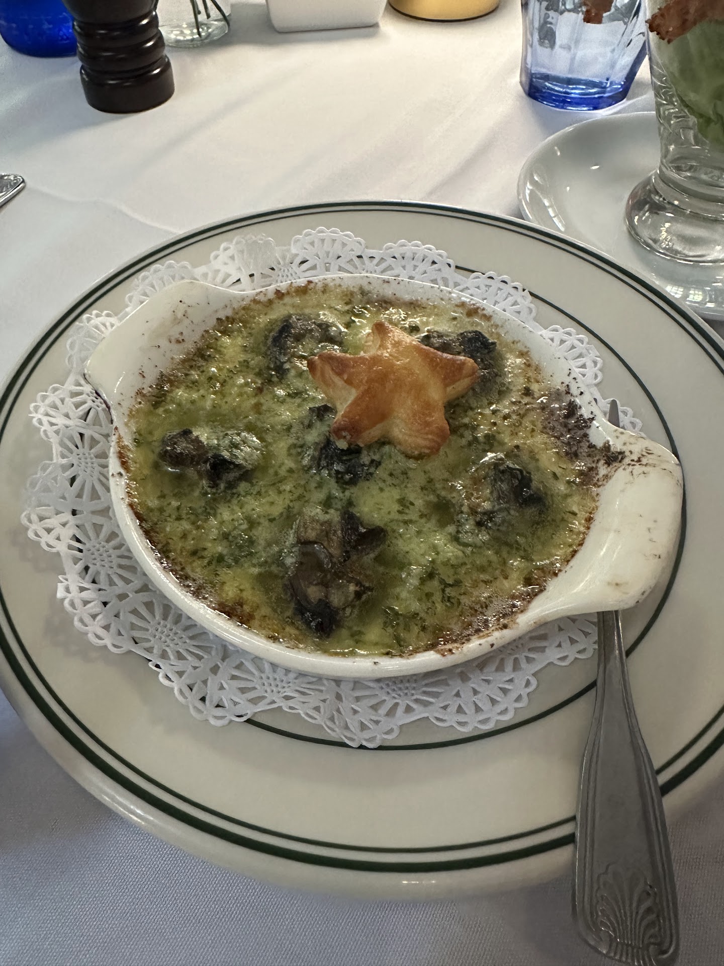 I really want to love this place. The ambiance is lovely, and the staff largely seem friendly and eager to please. The wine list is superb--no denying that. However, the food was just...fine. Nothing exceptionally notable or exceedingly awful. The pate maison was silky and served with cornichons, hard-boiled egg, minced red onion, and a mustard sauce, yet it was served with just five simple water wafers which don't allow you to spread the pate. Something more substantial like brioche toasts would work so much better. The escargot were nicely cooked but overly salty with an excessive amount of Parmesan-like cheese on top. For the main meals, my local flounder meunière was cooked correct but wildly under sauced and not nearly enough lemon in the sauce. That might be a personal preference (and there was a lemon wedge with it). My wife had the grouper cheeks in papillote, and while the cheeks themselves were perfect, the scallop and shrimp with the fish were overdone--the shrimp, in particular, were hammered. Oddly, the same accompaniments came with both dishes; in fact, the same thing comes with all the entrees: a very simple house salad (greens, dressing, and feta cheese), potatoes au gratin (perhaps the best thing on the table), and a deftly done vegetable medley of summer squash, carrots, and zucchini. The only dessert we tried was the bread pudding, which was literally served as two slices of a compressed bread with virtually no sweetness to it and lacking any sort of depth of flavor that cinnamon, nutmeg, or coriander would have added. It was by far the biggest disappointment of the evening. The service was commendable overall, but we felt rushed. While you may think a nice French cafe would be a relaxing spot, it wasn't really. We were in and out in 75 minutes. For example, we ordered our drinks appetizers and received the drinks promptly. I had no more than taken my first sip when both the pate and escargot came out--maybe two minutes after ordering. The runner wasn't exactly rushed, but she didn't present them either--just set and go. The entrees came out rather quickly, too, and while our server was very friendly and competent, there was a breathlessness about her that she passed on to us. Great for diner, not so much for a relaxed French experience. None of the dishes were explained to us--no description or mention of the technique used which I'm fairly certain was due to the dishes being mass-produced and kept warm. In the end, we were satisfied with our meal and our service, as well as with the overall experience. Yet, we weren't wowed. Charlie's is a solid restaurant but not one we feel compelled to visit again...