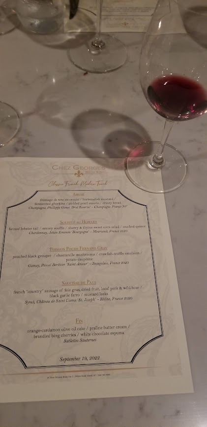 We have been in the area a little over 2 years now and have quickly found our favorites along with a lot of ok places. We kept looking at each other and asking the same question "Why have we not been here before?" From the moment you walk in your are warmly greeted, and even though it was our first trip, we were made to feel like we were regulars. We were introduced to the sommelier who gave us a quick walk around a well put together wine list offering to answer any questions at any time. Our serving "team" also introduced themselves by name and we were told there would be "additions" to the menu but they'd wait a while while we settled in to relax. We started with cocktails and the two of us that love dry martinis (one gin, one vodka) smiled broadly when our server (yes, I should remember his name, but it was such a long, fun, night, and I'm as old as dirt, so I forgot) said, "I'll tell the bartender "in and out" " #iykyk my wife and I shared the escargot and they were wonderful, She chose a chicken dish, I chose the wreckfish special. Our friends started with the deviled crab and then chose the duck, and the short ribs and at the end of the meal they exclaimed the short ribs were the best they'd ever had anywhere. As the courses were so varied, we were wrestling with the wine choice, so we put our trust in the sommelier who suggested a Pinot Noir (on of my very favorite varietals) we chose from the list and he was spot on with his reco, it paired perfectly with all four varied entrees. We ended by sharing come creme brulee and some outstanding cappuccino. The pace of the meal was perfect, our server (one of the few people we met who was actually born and raised in Bluffton) was amazing. We have added Chez Georges to our list of top choices. If you are on Hilton Head or just visiting it should be at the top of...