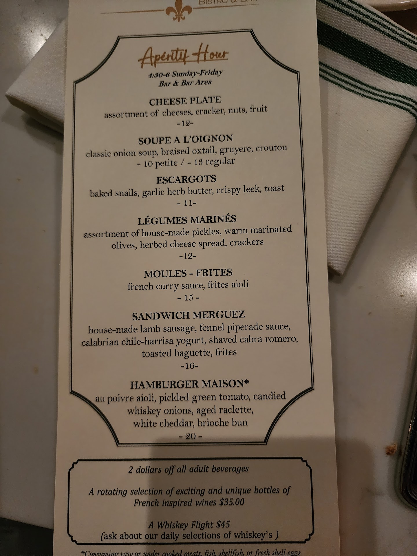 Read moreWe ate at Chez George tonight. We had reservations, so seating wasnât an issue. Our waiter was nice, and informative. The specials were nothing to write home about, so we all ordered from the regular menu. We started with the Escargots de Bourgogne and Mussels Sud-Est. The escargot was very flavorful, and was more something I wanted to try since Iâve never had them. The mussels had good flavor, but are just not my cup of tea. But my dad enjoyed them. For entrees, we had the Poulet, Saumon en Papillote, and Os de Porc. The poulet is their version of fried chicken, covered in a sherry cream sauce, and served with potato halves and wilted spinach. The flavor was great, with the sauce going well with the chicken. I didnât try the Os de Porc, but my father really enjoyed it. Itâs 2 bone-in pork chops. I had the salmon. The fish comes in a little baggie that they cut open, and then pour a sauce over. The fish itself was rather plain, but the pour over sauce was good and the vegetables it came with had a great flavor. It was also served with a creamed kale and spinach with breadcrumb topping. I didnât care for it, as itâs made with Pernod which gave it a slight sweet flavor. But my mother enjoyed it. Overall, the food was good, not great. The service was good. I would try it again to give them another chance, but with so many other fantastic options on the island, itâs not one weâll be putting on our...