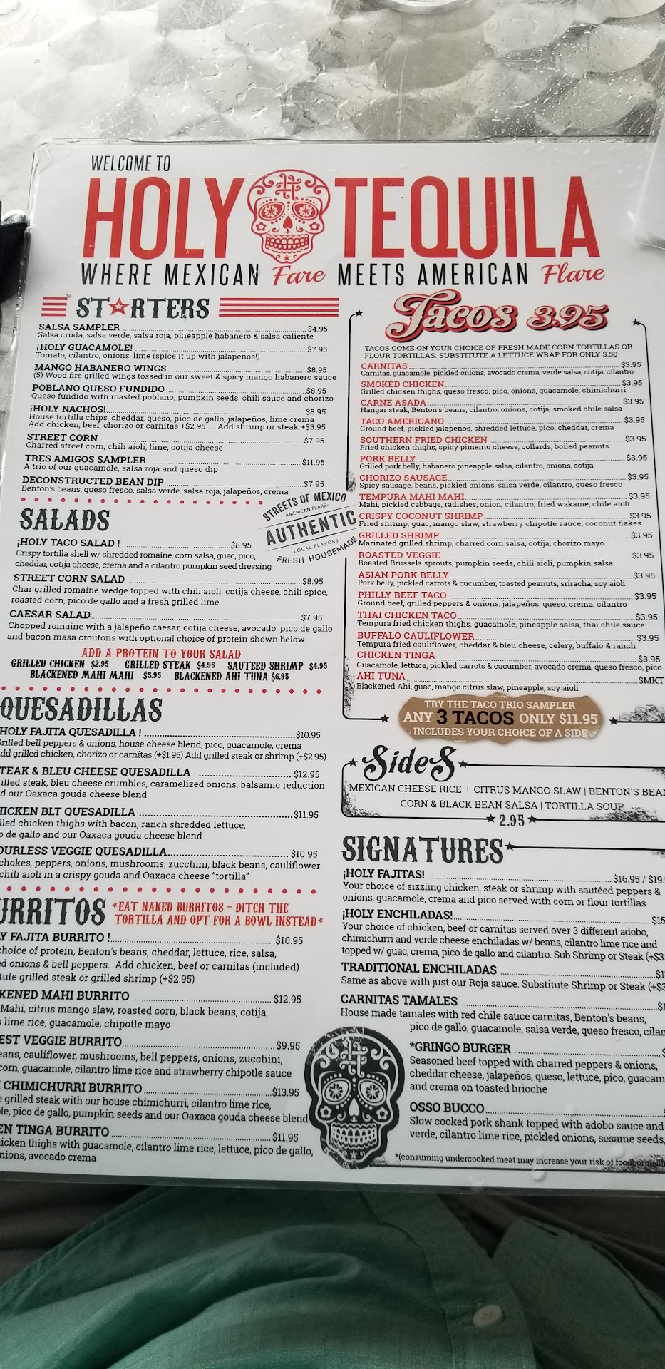 Read moreAmazing, fresh mod-mex restaurant with something for everyone. I ate here with seven of my extended family members, several of whom are very picky eaters. We were all extremely impressed with our meal. It appeared as though the restaurant had reserved tables for several large parties, but we were graciously accommodated and seated as soon as we arrived just before 6 p.m. this evening (7/16/15). Our service was spectacular; our server was extremely friendly and knowledgable, and our food left the kitchen in no time at all. Portions are right in line with the price point; everyone left full and satisfied with a smile on their face. As for the food itself......We ordered a pitcher of the classic margaritas; simple, fresh, and extremely delicious. One pitcher served six of us, with a little left over. Our salsa sample appetizer left everyone anxiously anticipating their meals; it comes with a variety of 5 fresh salsas, from very mild to very hot. I particularly enjoyed the extremely spicy smoked habanero salsa; it was different than any salsa I've experienced, and it complemented the others very well. I personally ordered the taco trio sampler, which includes your choice of three tacos and one side. I had one chorizo, one pork belly pastor, and one "taco of the day," which was a variety of their grilled chicken taco today, all on corn tortillas. All three of my tacos were fantastic, but my favorite was the pork belly (grilled pork belly, habanero pineapple salsa, cilantro, onion, cotija cheese). My side was the Bentons beans (refried style); they were fresh and delicious. (I had a few bites of my wife's Mexican cheese rice, and it was also delectable!) I strongly suggest you give Holy Tequila a try; it has ruined me for all...