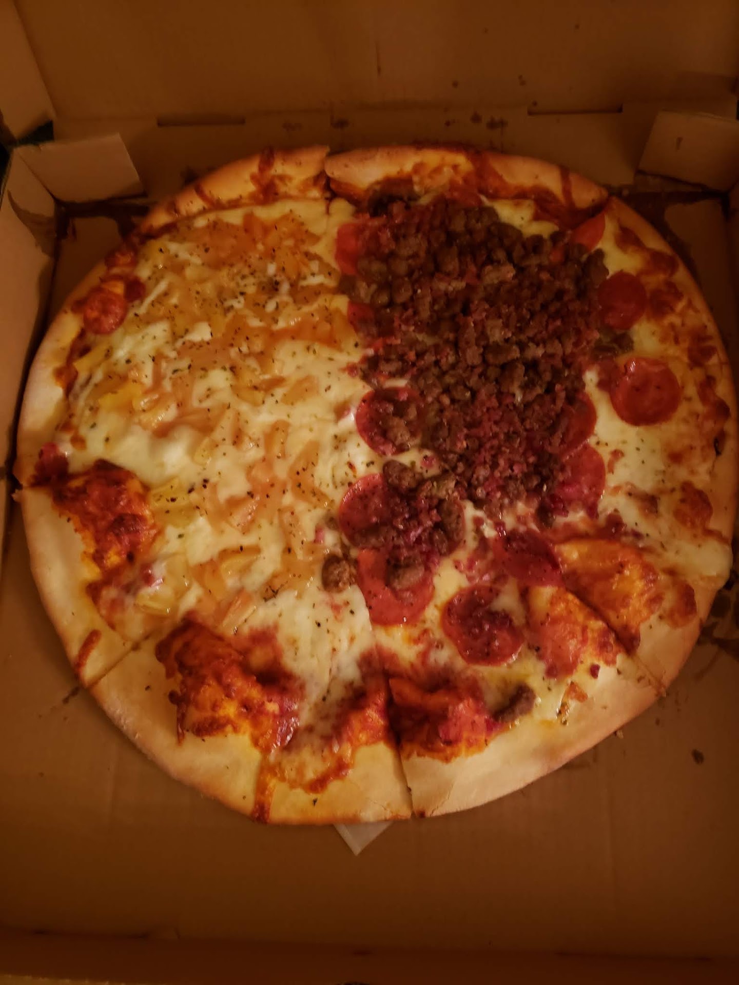 Read moreVery disappointed overall with this place. Gotten pizza from here every summer since 2014 never had this kind of problem with the pizza. I never write reviews but after spending almost $30 on a "build your own" 16" pie, this is what I saw after opening the pizza box. Half of it was supposed to be a meat lovers pizza, the other half just pineapple. Would think the worker would notice that a fourth of the pizza is entirely covered in sausage and try and spread it out but I guess not. They didn't even honor the discount for Sea Pines owners when I asked. They said they "don't do the discount here", which isn't true. Probably will be my last time buying pizza from here even though it is the most...
