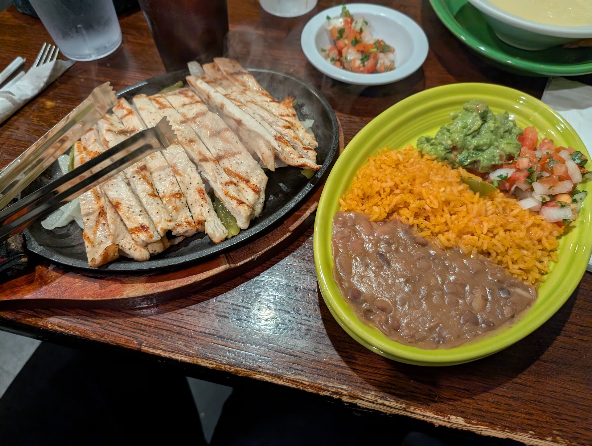 I ordered chicken fajitas. The meal arrived in a reasonable amount of time following our order, and I was impressed with both the presentation and quantity of food. On a hot skillet were the fajitas, the perfectly grilled chicken resting on a bed of onions, peppers, and tomatoes. A side plate held the accompaniments to the fajitas: beans, rice, pico de gallo, and guacamole. The meal was made complete with four corn tortillas served in a warmer. I had the choice of flour or corn when ordering.