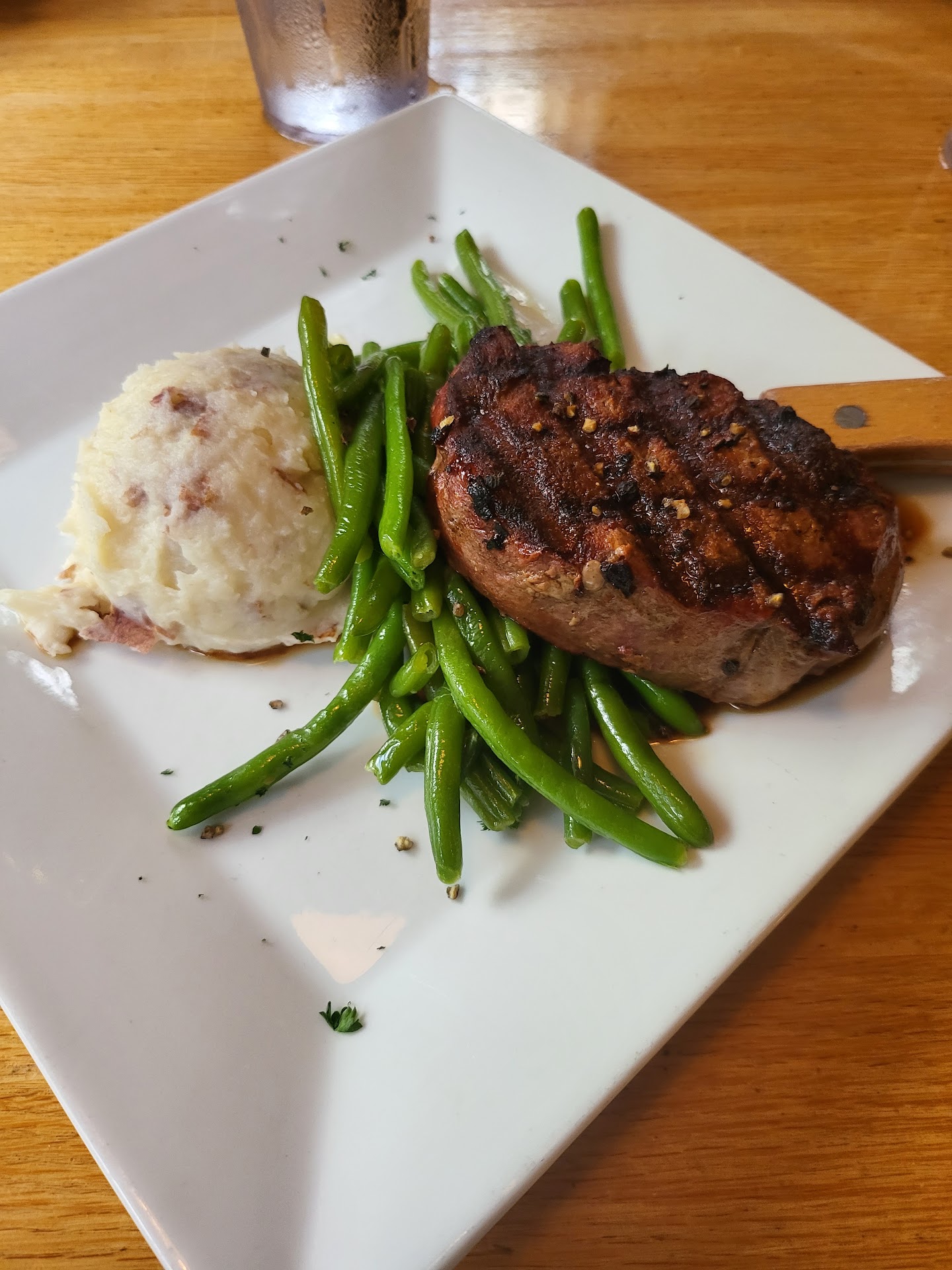 There was a plus one in my party. I had a filet, green beans, and mashed potatoes. My plus one had a filet, broccoli and French fries. A Caesar salad each.