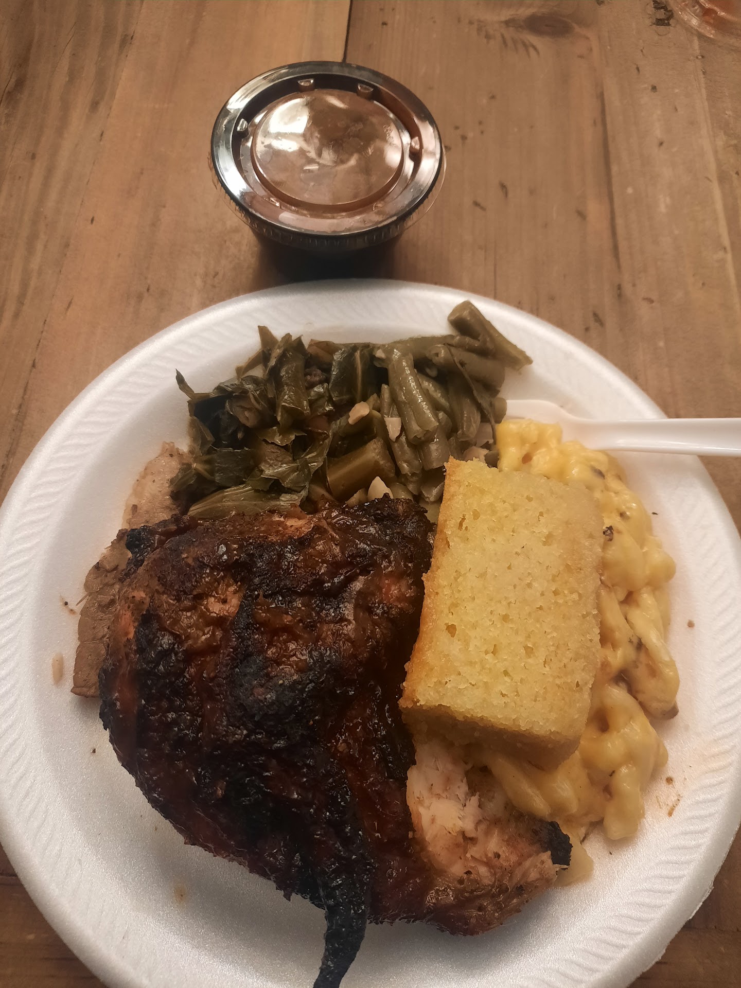 This is when the service plummeted too. When this was politely pointed out, our server stated "it's okay because it's smoked" In a dismissive tone. When we explained that the chicken was not edible if it's bleeding she continued to be dismissive and offered to "take it away". I had to ask her to replace it with something else (beef brisket) which she did. She then charged the additional $2 for upgrading the plate to beef brisket, not something I perceive to be good practice after potentially poisoning a customer.