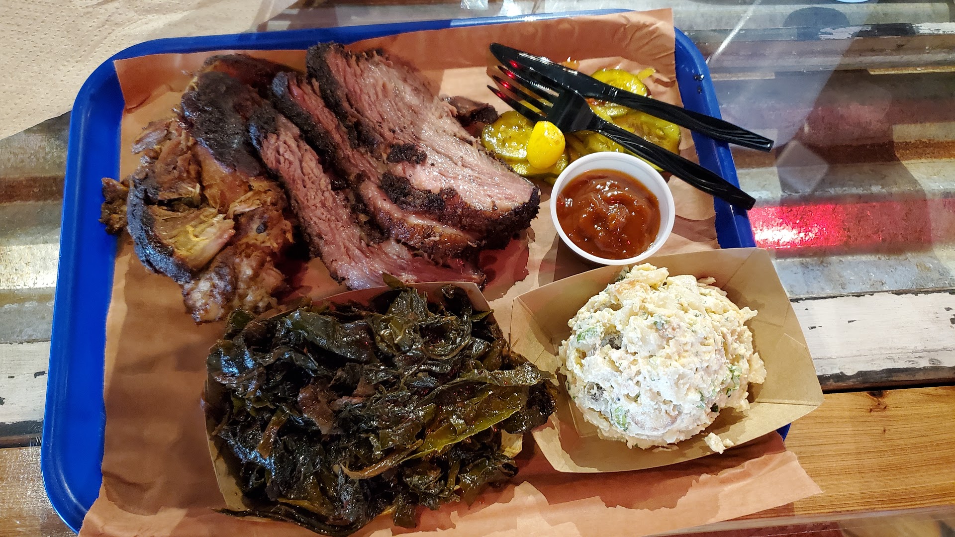 First, let's talk about the good. The atmosphere is great! It's my kind of place, with counter service, beverage bar, interesting decor, and ample seating. The people serving us were also friendly and helpful. Their unsweetened iced tea was brisk and fresh. And the meat selections we chose were good: brisket and chicken. They also do not scrimp on portions, which is a good thing, and gladly give out to-go containers if you can't finish your meal.