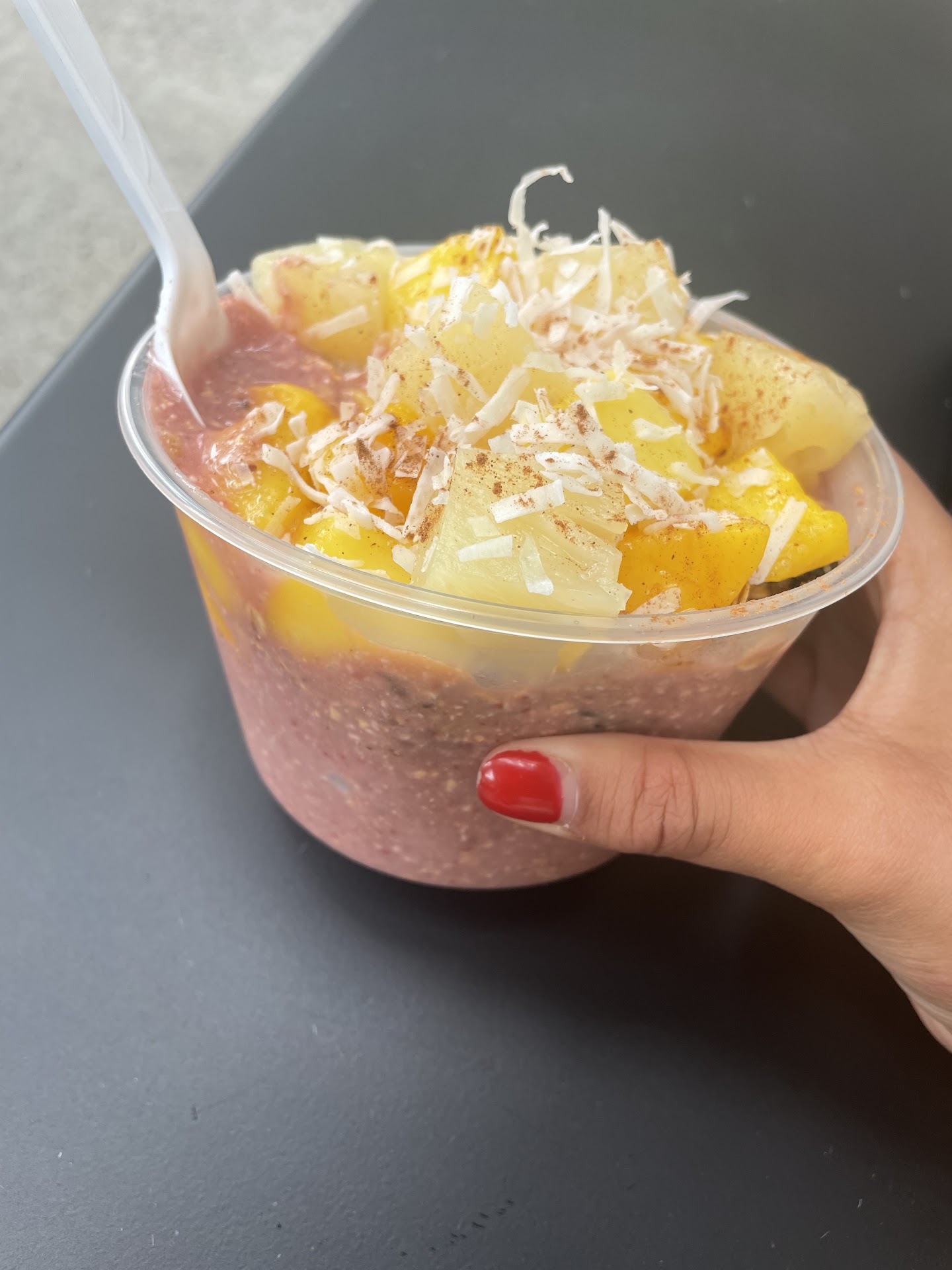 Ordered a strawberry and blueberry acai bowl which turned out to be a 90% toppings 10% completely melted acai bowl. The fruit toppings tasted fine, if not a little odd (pineapple tasted like it came from a fruit cup, chewy blueberries that made me think freeze-dried, squishy mango though that could have just been that specific fruit) but once I managed to excavate down to the actual named item of the bow (the acai) I found the entire thing was pure liquid. Not in a Oops! Silly me took to long and it melted kind of liquid. Almost immediately after recieving my order I shoved and maneuvered my toppings down to reach the very thin looking layer (thank you see-through cups) which was a feat in itself as again nearly the entire cup was toppings, and found nope that whole thing was actually just liquid. I was in the store when this happened, about 3 seconds after I was handed the bowl. Unless someone decided to hit my bowl with a liquidization ray super-villain styler I struggle to believe anything could have melted that fast. I didn't talk to the worker about it because I was with my friend and we were on a tight schedule but you truly have to wonder. The worker was very pleasant throughout the entire process but when he was getting the acai for my bowl did he not notice it was all liquid? Could someone fill the bottom of a bowl with something akin to the texture of water and go "yeah thats right" and move on? If something is wrong with the acai just confess and I'll order something different no problem because now I'm just left with a bowl full of fruit I'm fairly convinced was thawed from being frozen, three sips of acai, and the single ice chip...