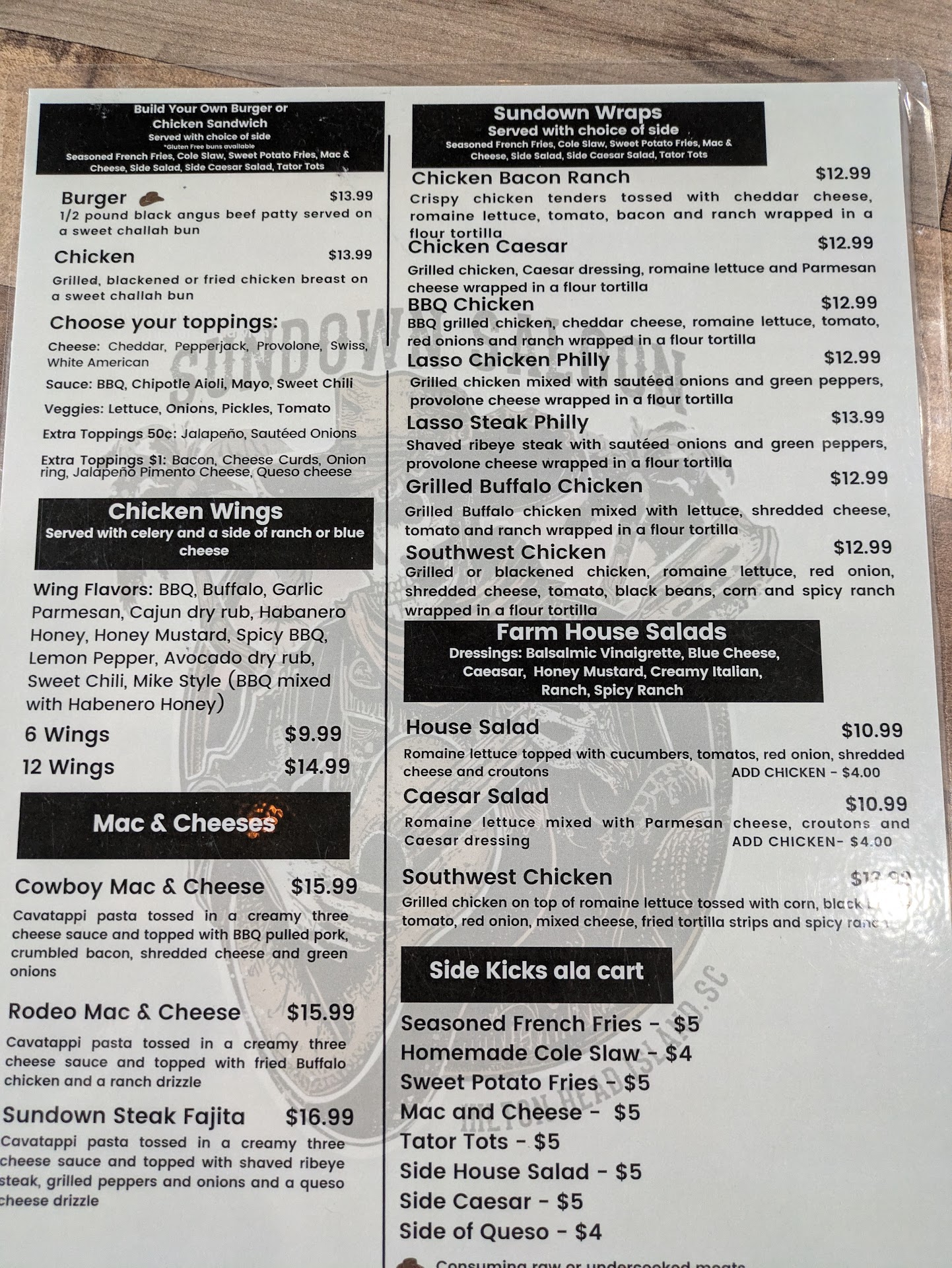 Read moreSundown Saloon is a delightful gem of a restaurant tucked away close to Hilton Head Airport. After indulging in several of the Island’s much higher priced and overrated restaurants and overdosing on seafood my wife and I needed a break. WOW, did we find it at Sundown Saloon! It truly was impressive, and a not to break the bank eatery with burgers and sandwiches that are off the charts outstanding. We started off with a couple of appetizers of pretzel bites and onion rings. I am not an onion ring guy quite honestly, that’s my wife’s territory, but they were prepared to perfection and delicious. My wife thought that they were the best she had ever eaten. The pretzel bites were particularly good as were the beer selections. I had a build your own burger that was made to order and simply delicious. An 11 out of 10 on the burger charts. My wife had a Philly Cheesesteak which she said was also the best she ever had. The atmosphere of the place was so enjoyable, comfortable, and relaxing. The entire experience was enhanced because of meeting the extremely friendly and engaging owner, Tasha. Chatting with Tasha was the icing on the cake and gosh does she make you feel welcome and appreciated. Kudos to Tasha and her staff for a tremendous lunch and we cannot wait for our return trip to the Island to see you all again. Keep up the magnificent work....