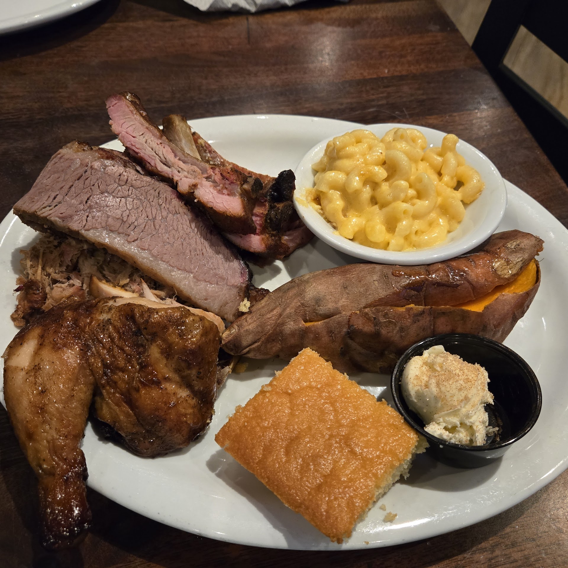Read moreNever been so disappointed in a restaurant. I had a few friends recommend this place on Hilton Head and all I can say is that this was definitely a disappointing experience. The restaurant itself has a nice atmosphere and the service was good. Now the food was where it went downhill. Now my wife and I have had plenty of BBQ. It is one of our faves but when it came to this place they shouldn’t have it on the menu if you can’t do it right. We have visited grandparents in the nursing home and have had nursing home food and this would be what I would compare it too. It absolutely had no taste! No smoking flavor or flavor from a rub of sauce. Even the sides were bland. My wife got the smoked chicken, baked potato, and macaroni and cheese. None of these had flavor, she doesn’t salt anything and she added salt to all the items! The baked potato looked like a shriveled up old shoe. The chicken at least was juicy but didn’t have flavor even with the barbecue sauces they provided which were very vinegary, you couldn’t get much taste. No we didn’t have Covid either. I tried the pulled pork, corn on the cob, and smashed potatoes. The smashed potatoes were good and had some flavor but the corn was meh. As for the pulled pork it was chewy and dry and of course had no taste. Again the barbecue sauce couldn’t save it. My wife ate a quarter of her meal , I ate half trying to save it. When the server asked us how it was we said it was ok. We don’t usually send food back or have them take it off our check because we know how hard it is for restaurants right now. Usually I don’t even complain but I had to warn people about this one especially for the prices. The food is definitely not worth the cost and definitely the most disappointing food experience I have had on Hilton...