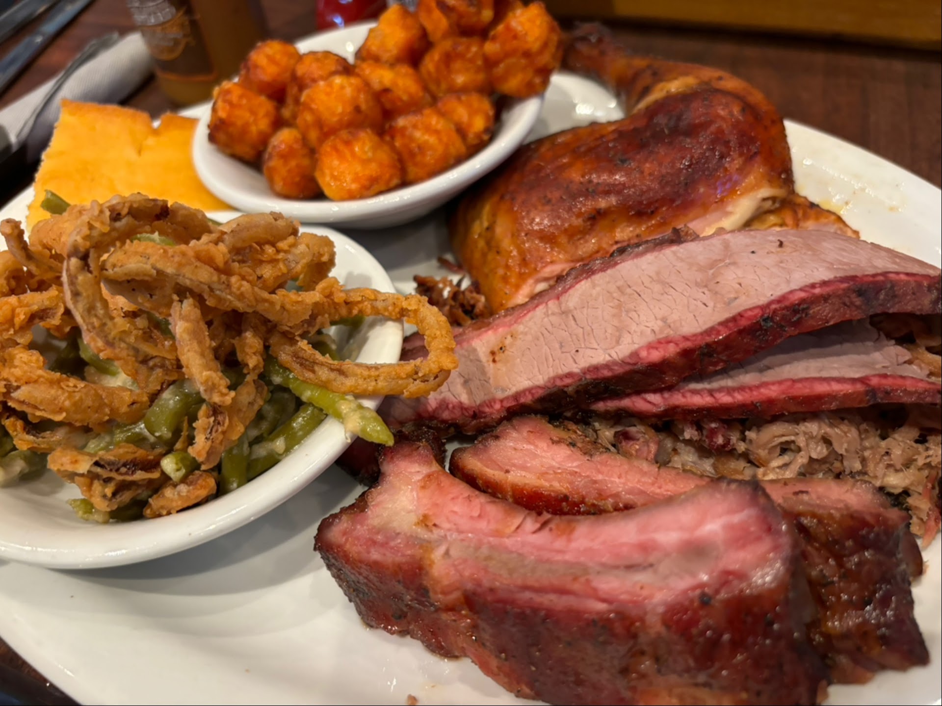 Well. . . . . Sometimes it just all starts off wrong. I hope that my experience today is the exception, and not the rule. Let me start out that their new building is beautiful. When we walked into the restaurant, there was no greeter. I stood there for a minute or two and still no one. I then step into the dining room and asked "do we just take a seat?" So they took us to a booth. In our seat we waited much longer before I asked a passing waitress to have our waitress come by. She responded she was our waitress and she'd be right back. I ordered an ice tea and asked for another menu, I had only picked up one when I walked in. Ice tea showed up quickly, had to asked another waitress for another menu. After a few minutes we got the menu. Our waitress passed by several times without asking if we were ready to order. Sooooo then I overheard her and I guess, her supervisor. It seemed to me she was saying she was over loaded. I don't know, that was just my impression. I probably at this point made it worse. I spoke up and said that we didn't mind moving to another table. She said defensively "oh no she would be right back" while saying "all the restaurants on the Island where short handed and we wouldn't get any faster service elsewere". In a couple minutes she returned and took our order. The food came out quickly. Our waitress returned right after and asked if everything was ok. My wife and I were a little shook up. We replied it's fine. This is our first time to the restaurant, we are trying to relax. We had ordered a large plate that had chicken, brisket, 2 ribs, and pulled pork. Well, the food wasn't hot just kind of luke warm. The brisket and the pulled pork was not well seasoned. The chicken was dry and cool. Because of the other stuff we decided to just suffer through it. We did ask the manager over, and we tried to explain, because I believe if they are not aware, they can't fix it. He's response seemed like he thought we where trying for a free meal. We had eaten most of the plate except 2 oz chicken meat, baked sweet potato, and sweet potato tots. He explained that if we had called him out sooner he would have fixed it, and I believe him. About the front door not having someone to seat you he said he could not afford someone to do that.🤔. Wow. First impressions are very important. A word to the management. Always treat your customers like they are right even if they are wrong. And be truely friendly and pleasant. It goes a long way. I hope this is a one off. But I...