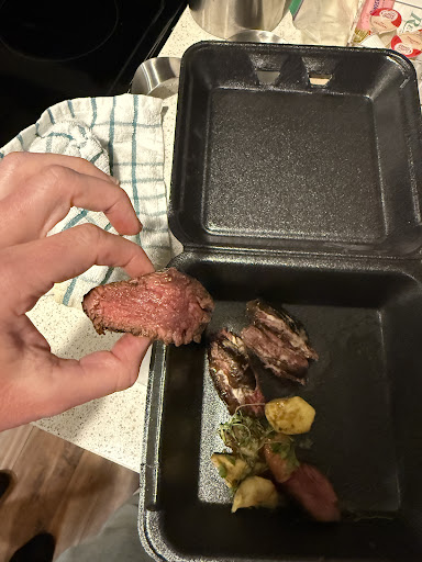 (Photo included here is of my 'med rare' steak AFTER it's been sent back to the kitchen, come back, sat on a table for 45 minutes, been in a togo container, and it's STILL too rare. Sorry if that's gross but like - I needed photographic proof to be able to sleep tonight.)