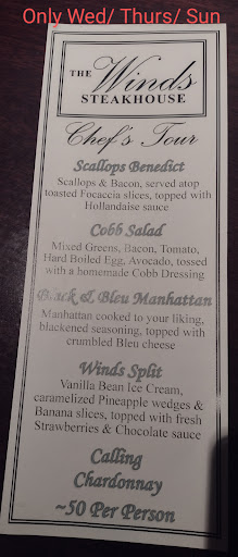 Read moreIt was very busy for a Wednesday . Neat way to get on wait list. They used your Cell to message you as to when table ready. We actually had our name on Grill wait list too. Easy to cancel thou. We had an appetizer and entree Walleye & Chicken Marsala. Both were excellent. We had a great server, Kathy, so attentive. Great service, great food, good price. It is May 8, 2019 and just finished the Chefs Tour. A great wine flight to compliment our food. Caprese toast, salad, steak with Manhattan sauce topped with scallop and marbled cheesecake. More great service. It is 2020 and we do not do the chefs tour, but enjoyed our meal. I included the March tour as not on line. We had seared Halibut and sea scallops in white wine, cream. Bonappite. It is 9/24/23 and we arrived at 5 pm when the Winds opened. We tried calling for reservations from our room but no luck. I am including reservation info. We were greeted by Ricky E and told about it Chef's Tour. We were excited about the menu and included a glass of Chardonnay. We were given our Chardonnay and a bread basket, yum. Our scallops Benedict came and it was fantastic. Kudos to the chefs. Next course cobb salad. Our main course Black & Blue Manhattan steak. That also had choice of potato, we chose cheese potato. Also a vegetable medley. Was just great. Now comes the dessert and winds split was amazing. Great waiter, atmosphere and amazing food. Keep in mind this is only available Wed,Thurs & Sunday. Menu changes monthly. Hope you can stop for this and make it a special evening.