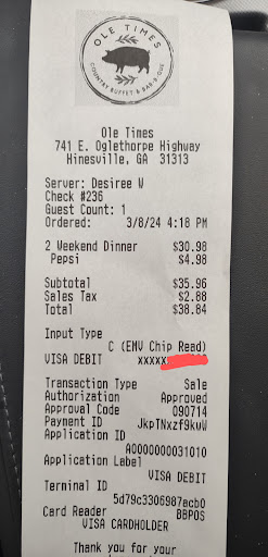 The menu of fish, steak and chicken veggies like cabbage, carrots and green beans, mack and cheese, chicken and dumplings and dessert of pies, pudding đŽ cakes etc. hot and steaming. The selection is quite good the fry chicken, not so fried, it was a wee bit hard.. Service was good, and the atmosphere is very pleasingly background music and good food. The prices is by the portions, you need wisdom to portion out your selections. It could be quite costly. While I was there they mop around the tables and the floor it was clean and fragrance. Also we chatted about the employee photos on the wall, and their shifts asking questions to better acquaint ourselves with this Family of ole times it is not a Diner it a Buffet. it was quite the ole Times energy and spirit I must say. Their personal carpark for everyone both the disabled and elderly with wheelchair, walkers etc and their restroom makes the day or night what it is.
