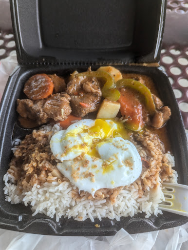 My first time eating Filipino food, combo comes with a drink, got the beef caldereta, holy cow that was tasty! Nice rich sauce, nice spice not overwhelming, well cooked veggies and rice. I'm pretty sure the egg was poached and cooked to order. He asked how I like my egg which I thought was a good question for the customer because I like a runny yoke. My meal was hot, delicious and served quickly. I would have given 5 stars but there was more fat on the beef than I would have liked for the price. I'm sure that cooking it with the fat on is a must though. He is parked next to the PX where there is a pavilion to sit...