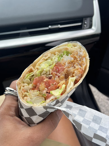 The spicy fish wrap delights, each bite with crispy cod, spicy pico mayo and lettuce.