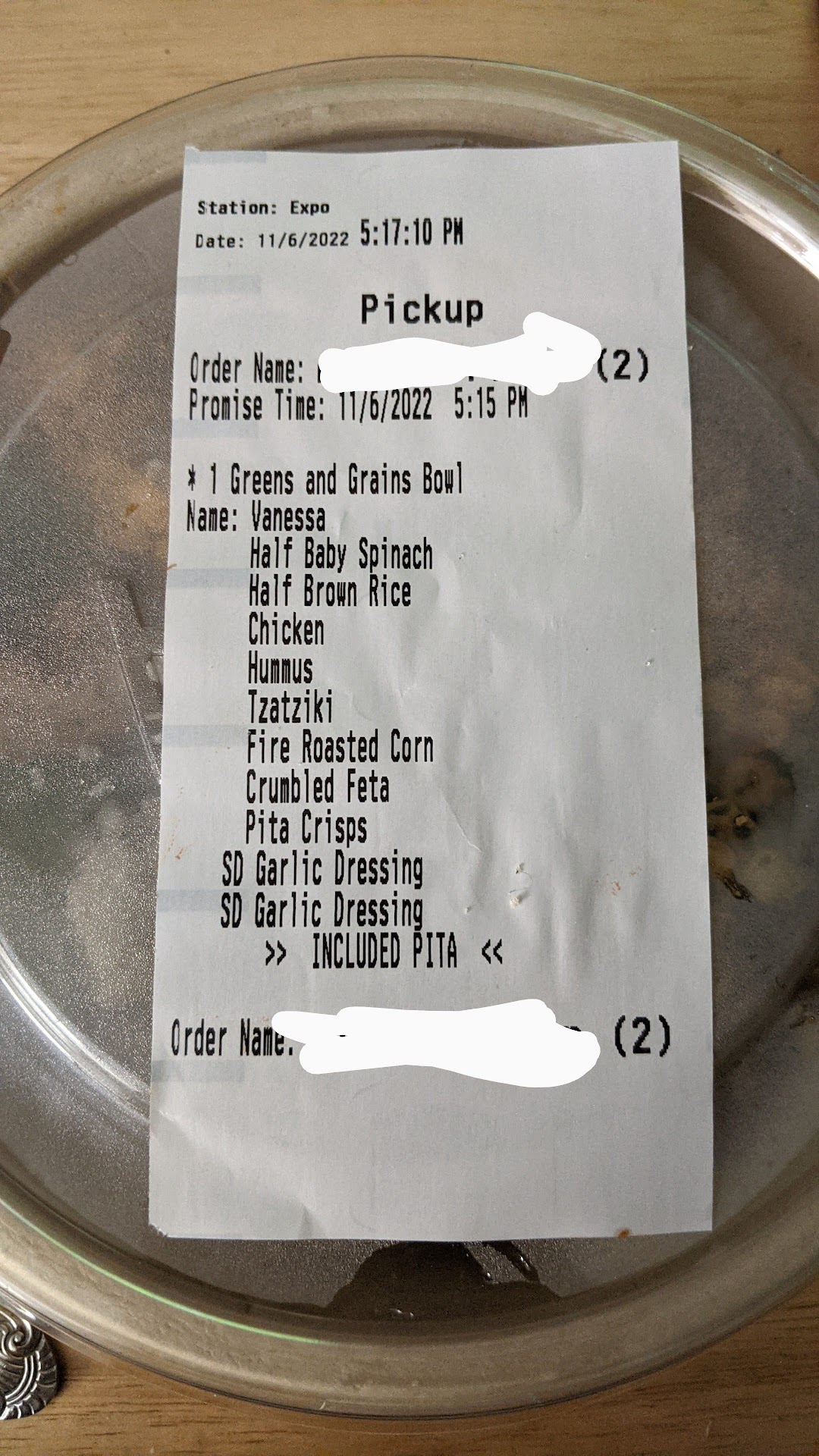 Changing my review from 3 stars to 1 from two months ago. I'd give 0 if I could. No dressing given on my order & no pita crips or include pita for both orders. Asked for a bag during online checkout, NO BAG. The dressing we did get for the other bowl was a tablespoon, it didn't even fill halfway the small container given. Overall such a disappointment. Definitely going to let others know this place can't make things correctly, that's clearly put on the order slip. Got more in the bowl when we dined in last time. Portion is sad for price you pay. Probably not going to get food from here ever again.