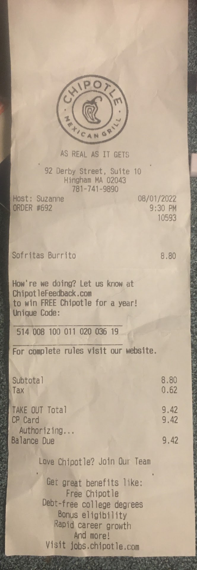 Read moreDefinitely the MOST DISGUSTING Chipotle I've EVER eaten. I recently recovered from what I'd definitely define as food poisoning. I don't ever get my bowls from this location, but my mom got me a bowl and I was hungry, so I had to eat it. While I was eating, the only source of meat I got was basically old, burnt skin of a chicken. The rice was undercooked and the lettuce was not fresh, so that was even worse (especially since I don't get lettuce when I order my burrito bowls myself.) While I was eating, I did feel a bit off, so I just stopped. By this time, it was too late. I woke up at like 2:00 A.M. the next morning with the WORST stomach ache. I got diarrhea but was finally able to return to sleep. At around 8:00 A.M., I got that sour feeling in my mouth that I was going to throw up and I did. I then had to take my seat back on the toilet and do my business there. I went to drink some lemon water to try and cleanse my body of the toxins that the Hingham Chipotle still has lingering in their food, but then I throw up again. For the rest of the day, I'm almost as weak as I felt when I had a weeks-worth of mono. I also pooped maybe 7 times that day as well. Don't even get me started on the next day. The diarrhea and throwing up continues. This is the moment when I finally realize what gave me the WORST food poisoning of my LIFE! I then have to lug myself to store to buy some Gatorade to restore my body of electrolytes and stuff. Anyways, even though I was an AVID fan of Chipotle. I WILL NEVER, and I MEAN NEVERRRR, EAT FROM THIS CHIPOTLE AGAIN. AND NEITHER SHOULD YOU! I think I'll take a break from Chipotle for a while, too, like I did to Panera after the supposed "caesar" dressing made me throw up, too. I returned to Panera Bread maybe a year and a half later, so I can guarantee that I won't be eating Chipotle ANY time soon. And that's a fact! (I'd give this zero stars, but hey, I'll give a star for two strenuous days of uncontrollable vomit and poo!)...