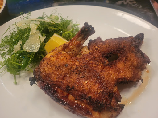 My wife and I randomly chose to have dinner here on an impromptu date night Saturday night, March 15. I'm so happy we did! We started with an old fashioned made with Buffalo Trace and a smoked apple pie old fashioned. Both were good, although we preferred the regular old fashioned over the other. Next round was 2 side car martinis - one in original form and the other was their cinnamon side car. I asked for a cinnamon sugar rim and both drinks were fantastic. On to food, we started off with a wood fired pizza made with house made pepperoni and house made sausage, along with basil and fresh mushrooms. This was hands down the best pizza I've ever had! Then we had a risotto rice cake appetizer which was also unique and tasty. After all that we decided to share a roasted 1/2 chicken dinner which was like none other! Finally, we polished it all off with a baked Alaska and washed that down with an espresso martini.