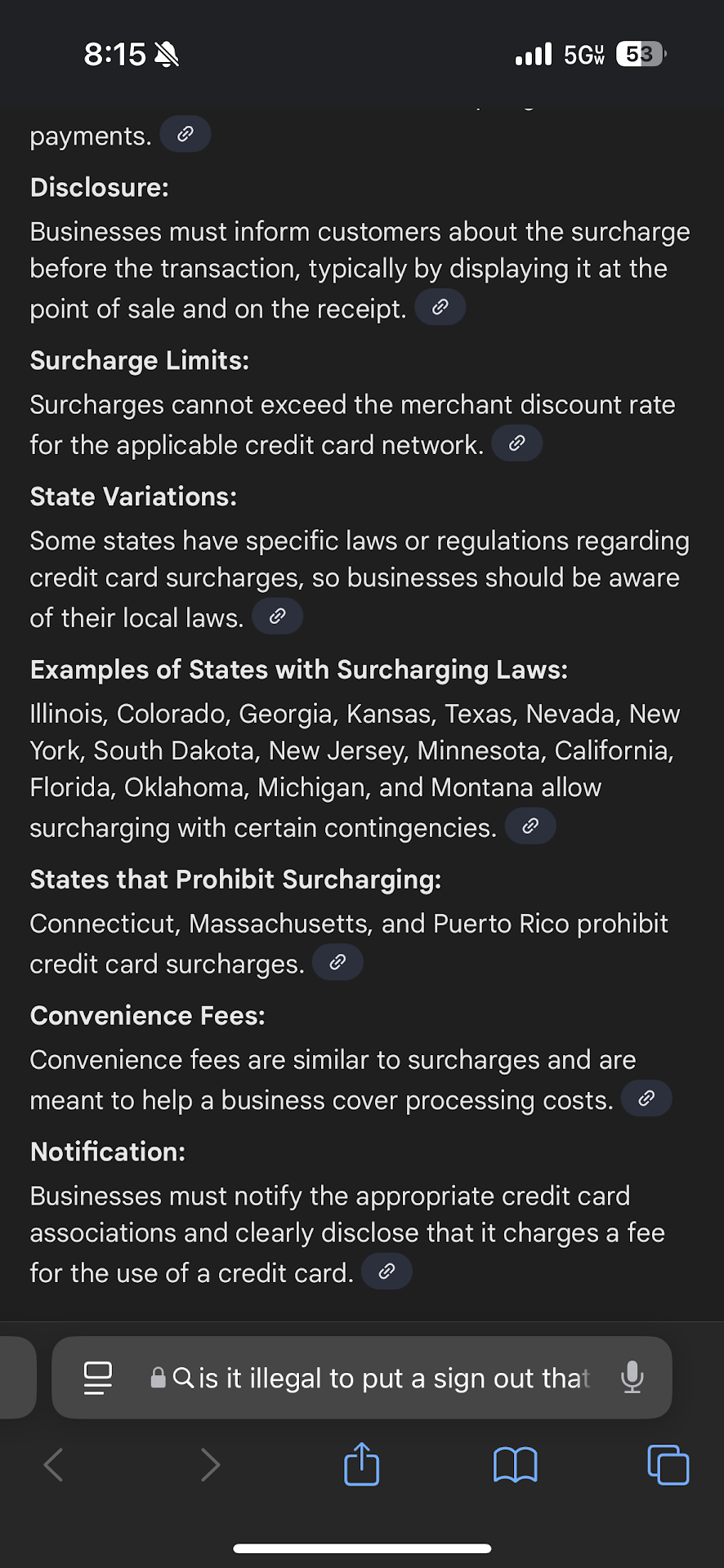 If fit to the owners! It is still illegal to not POST THE SERVICE FEE BEFORE YOU PAY! You can’t just put it on the RECEIPT! As per the GEORGIA LAW! You should actually go to our Georgia codes and look them up! As stated on the WEBSITE PRIOR TO IMPOSITION! And after with an electronic breakdown! Therefor...