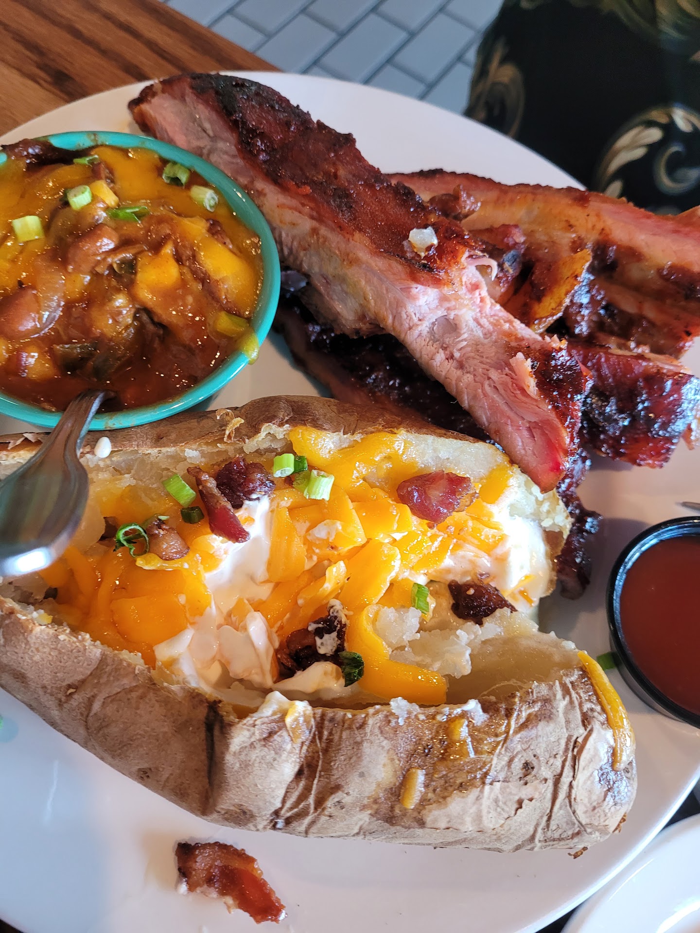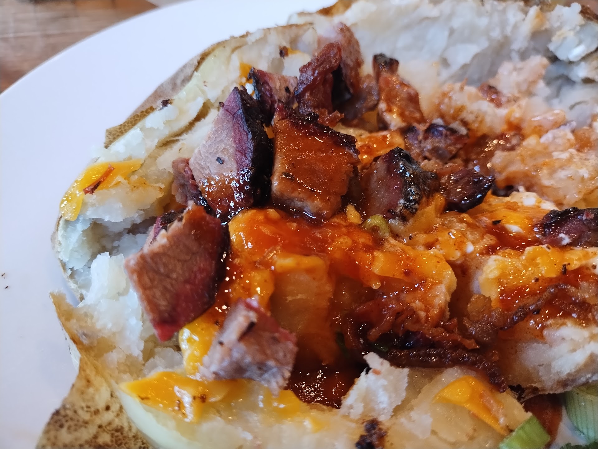 Read moreThe food was delicious. My only complaint for the 4 stars instead of 5 is that the meats were kind of dried out. I had the brisket sandwich meal with mac and cheese and collard greens and a jalapeño chedder sausage. My fiancé had the 1lb rib plate with a loaded baked potato and chili. For the appetizer, we had the loaded queso dip (comes with pieces of chedder sausage, but we decided to have it without the sausage), and we were given a complimentary basket of mini cheddar muffins. The muffins and the queso dip to start were very good. My mac and cheese and collards were delicious. Just the greens needed a little salt, which I added, and they were perfect. I had my brisket sandwich with rich marbled brisket instead of lean brisket. The slices and amount of meat were spot on but some parts of the brisket was very dry and was not very marbled but I did find a piece that had a nice fat to meat ratio, that was tender and perfectly seaosoned and it was DELICIOUS!!.. I wished the whole sandwich was like that, I would have ordered another Togo if it was..the cheddar sausage was delicious as well. They skin of the sausage was a little tough, but the inside was juicy and had great flavor. I tried his brisket chili, and we both agreed that it was good. It just needed a dash of salt. He didn't enjoy his ribs too much because some pieces were very tough, and he had a hard time biting a piece off the bone and some pieces he had to chew for a while. I had a bite of one of the more juicy looking ribs, and it was flavored well, and the smoke was on point. I wanted to try his baked potato, but it looked dry, so I decided not to. I asked him if it was, and he said no, that it was good, so that was good as well.. All in all, I'd go back and get the sandwich again but I'd get it chopped instead of sliced and will request to the server to let the kitchen know that I love a good fatty brisket, so they don't have to worry about cutting off alot of fat. Lol.. I do want to try their turkey sandwich and pie as well. Service was decent. He seemed overwhelmed with the 4 tables he had, so maybe he was having a small off day. Atmosphere was...
