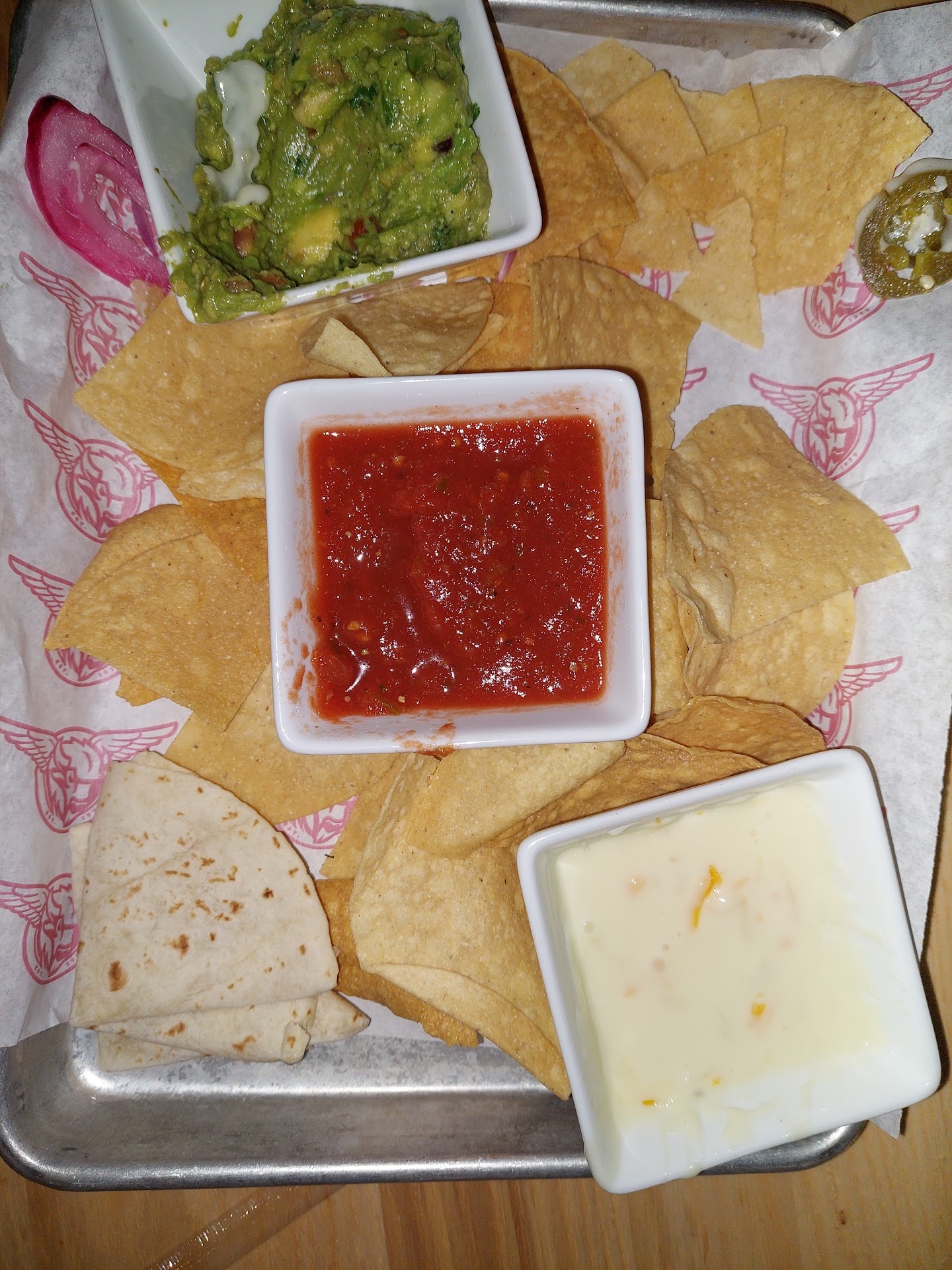 Then our waiter came over, his name was Darius. He was so attentive, courteous, and quick. There was a guy named Jeremiah who brought out our food. I noticed that I had one flat and nine drums. He, Darius and a very nice young man named Max were at the table when I explained my dilemma and they quickly went into action.